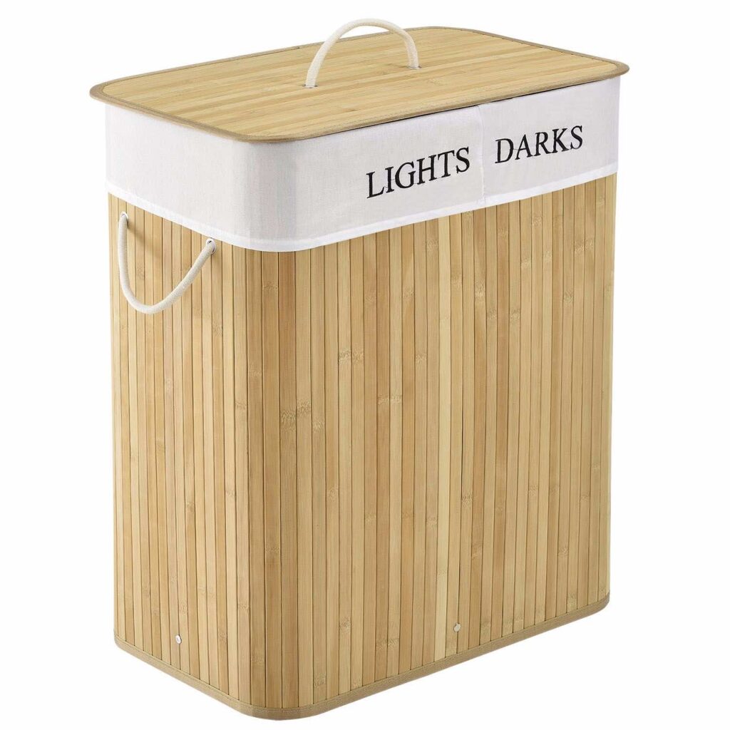 У фігурному бамбуковому кошику для білизни з кришкою (100 л, світло – коричнева) білизна залишається акуратною, непомітною і захищеною від запахів. Кошик розміром 52×32 см має достатньо місця для зберігання – ідеально підходить для сім’ї. У двох відділеннях ви поділяєте одяг на кольоровий та білий, що згодом економить багато часу! Надійний кошик можна розмістити в спальні або дитячій кімнаті, наприклад, або поруч із шафою, ванною або в кутку ванної кімнати. Знімний мішок для білизни забезпечує гігієнічне зберігання шкарпеток або спідньої білизни. Кошик білизни замикається і може бути легко піднесений до пральної машини однією рукою.