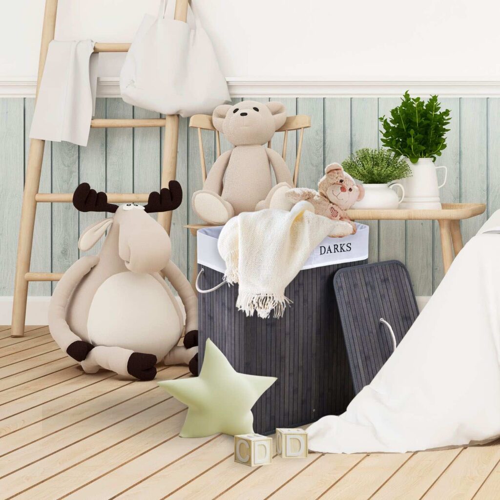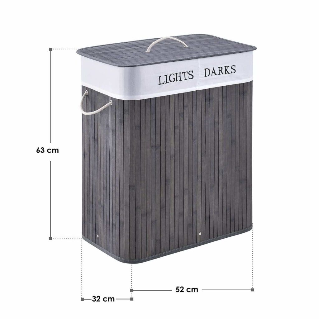 У фігурному бамбуковому кошику для білизни з кришкою (100 л, сіра) білизна залишається акуратною, непомітною і захищеною від запахів. Кошик розміром 52×32 см має достатньо місця для зберігання – ідеально підходить для сім’ї. У двох відділеннях ви поділяєте одяг на кольоровий та білий, що згодом економить багато часу! Надійний кошик можна розмістити в спальні або дитячій кімнаті, наприклад, або поруч із шафою, ванною або в кутку ванної кімнати. Знімний мішок для білизни забезпечує гігієнічне зберігання шкарпеток або спідньої білизни. Кошик білизни замикається і може бути легко піднесений до пральної машини однією рукою.