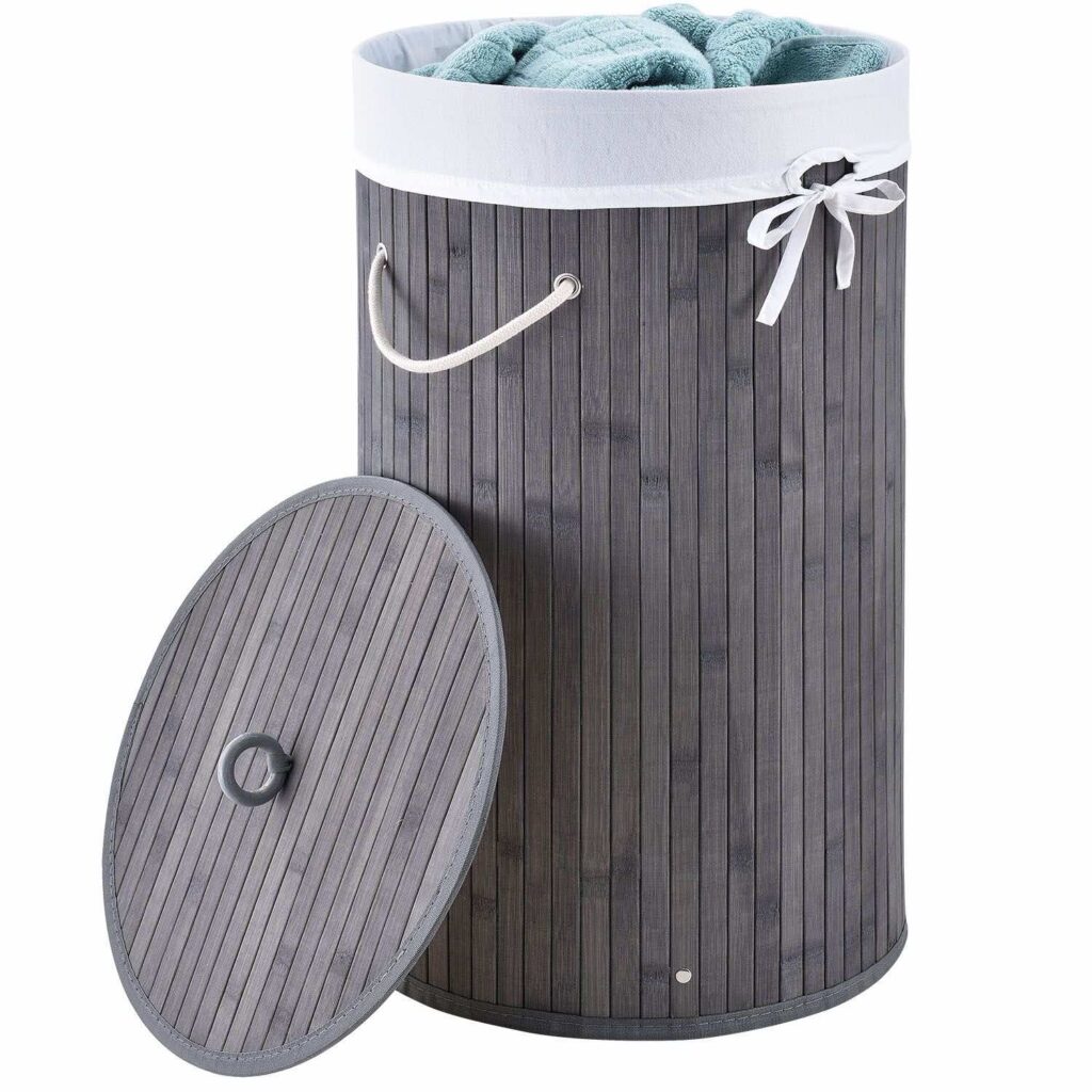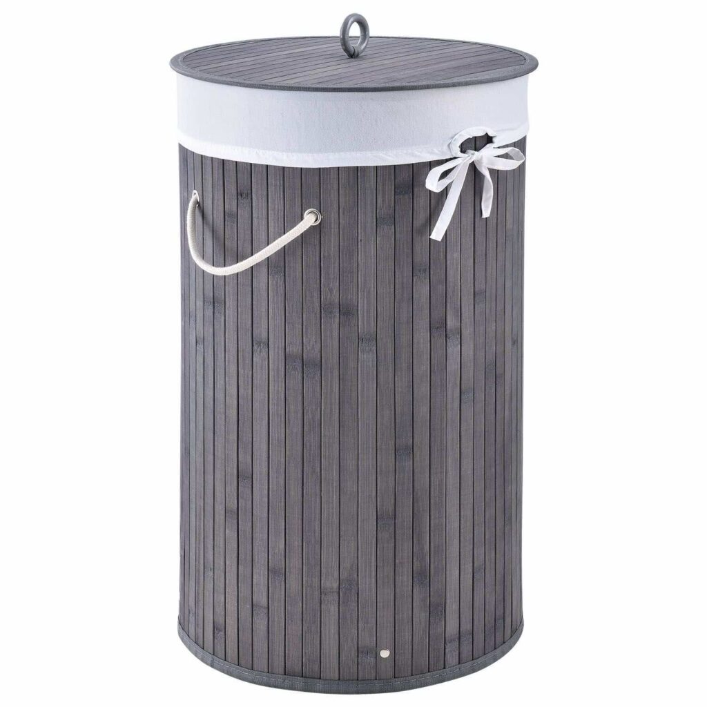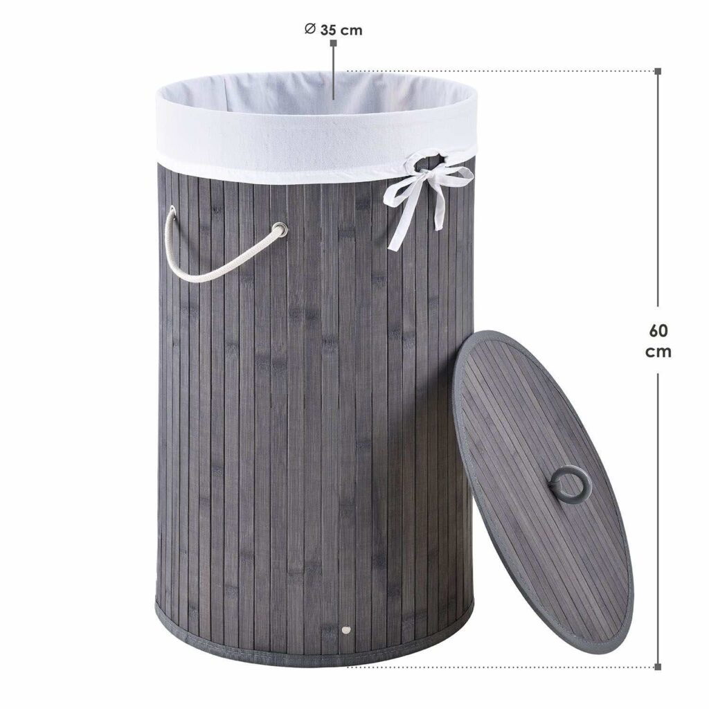 Круглий бамбуковий кошик для білизни Curly-Round (55 літрів, сіра) з кришкою та мішком для білизни призначений для акуратного зберігання білизни. Тримайте понад 50 літрів брудної білизни на сім’ю з 2 осіб. Для більшого порядку поставте кошик (Ø 35 см, вузький) у спальні або у ванній кімнаті. Для гігієнічного зберігання корзину можна закрити дерев’яною кришкою. Це позбавить неприємних запахів! У кошик для білизни також входить мішок для білизни з поліестеру, щоб ви могли легко переносити збірку білизни до пральної машини. Кошик для білизни має малу вагу та має дві ручки для перенесення.