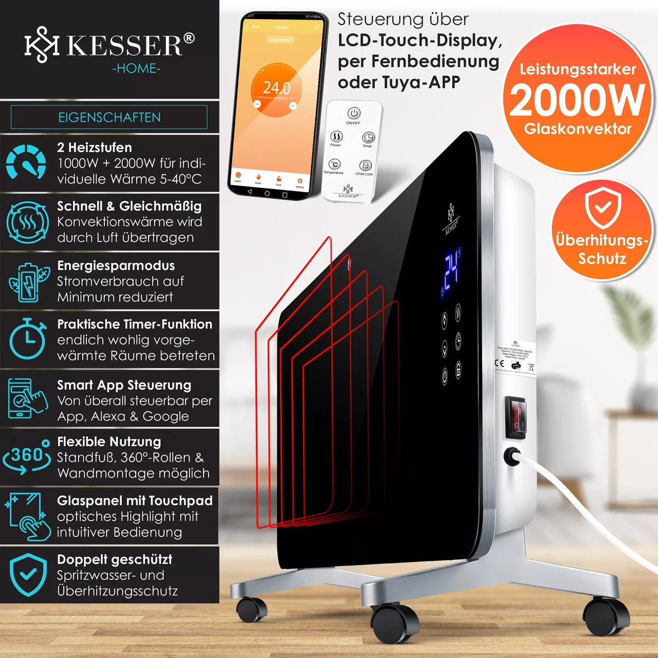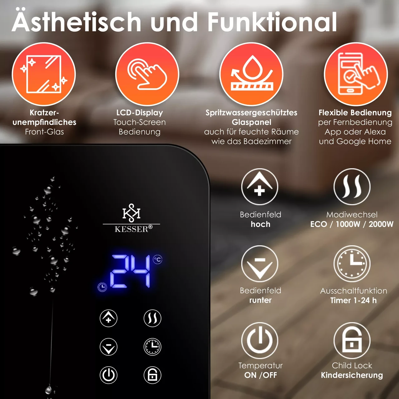 Завдяки компактній конструкції та можливості транспортування, тепловентилятор від KESSER можна легко налаштувати. Скляна панель захищена від бризок, тому настінний обігрівач також можна встановлювати у вологих приміщеннях.
