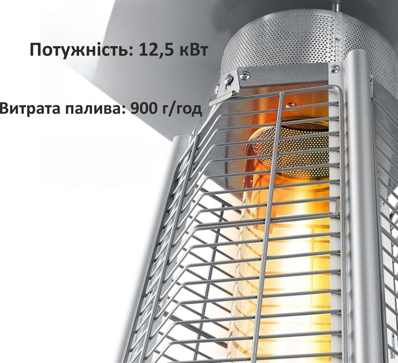 Значення Дані Теплова потужність 12,5 кВт Тип газу Пропан / Бутан Витрата газу близько 305 г/год Матеріал Нержавіюча сталь, скло Колір Сірий Висота приблизно 227 см Вага близько 20 кг Комплектація