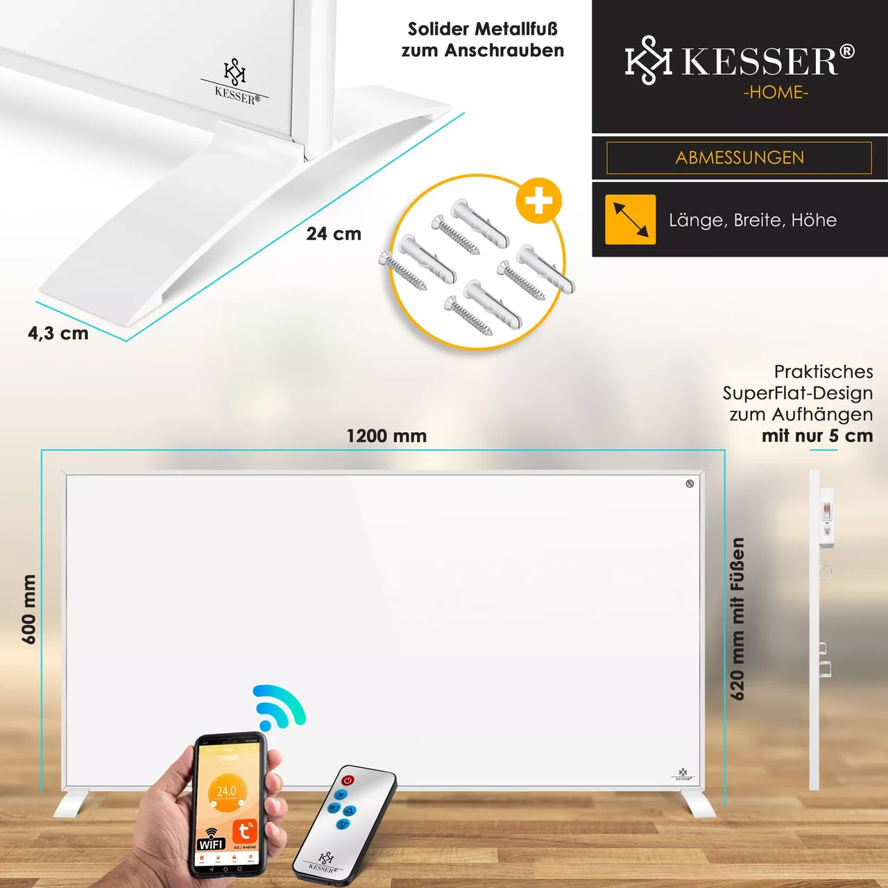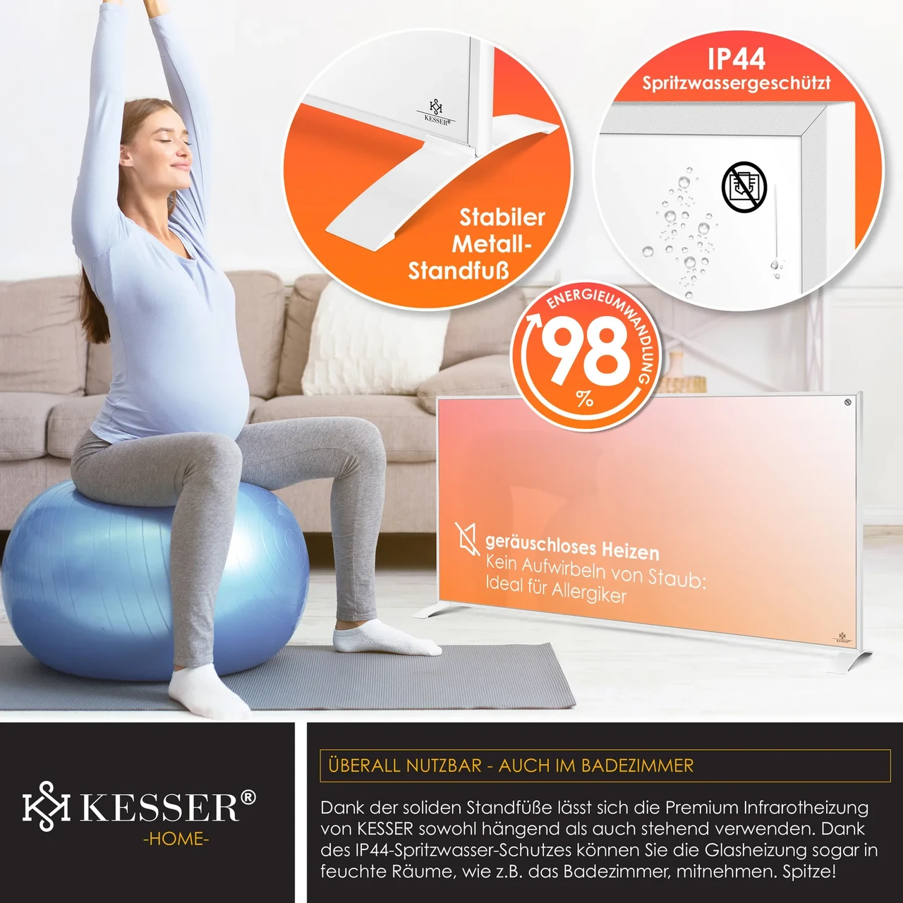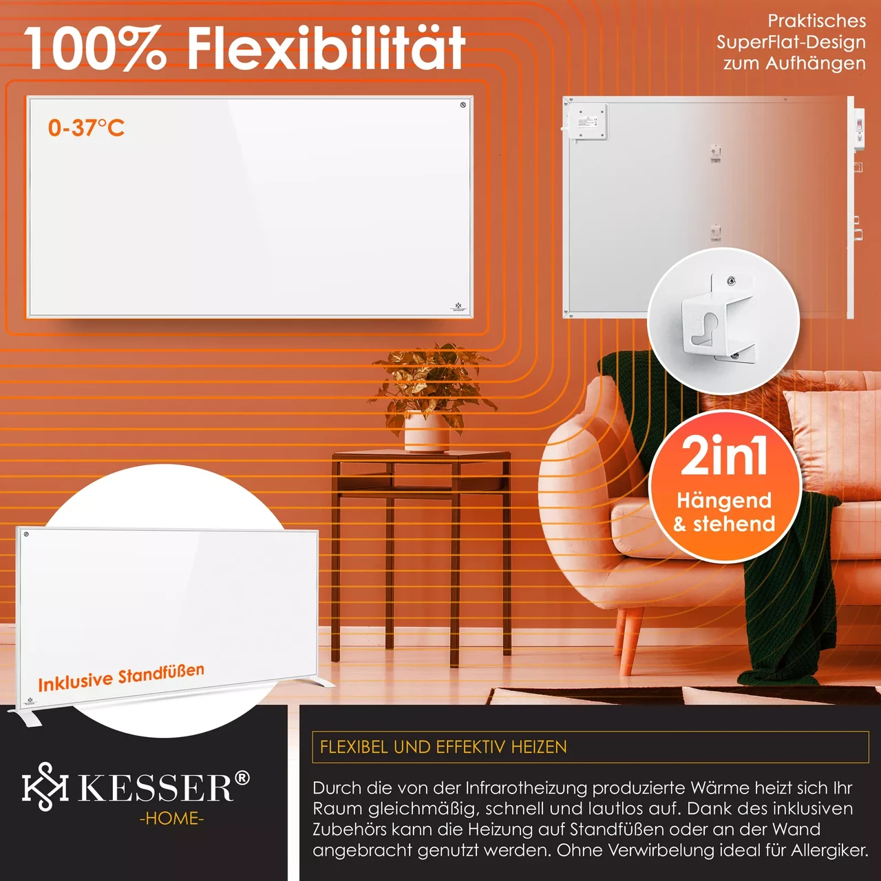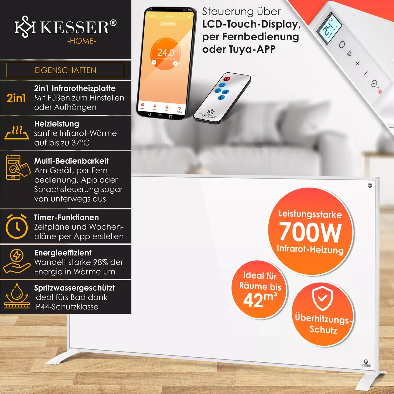 Інфрачервоний обігрівач KESSER 2-в-1 – настінний або стоячий. Клас захисту IP44, ефективний нагрів, захист від бризок, включаючи термостат, функцію таймера, нагрівальну пластину з карбоновим кристалом, РК-дисплей, додаток Tuya Smart і голосове керування. Ідеально підійде як заміна масляного, газового обігрівача або багатьох інших систем опалення. Сертифікація за класом захисту IP44 гарантує оптимальний захист від бризок. Додаткову безпеку забезпечує вбудований захист від перегріву.