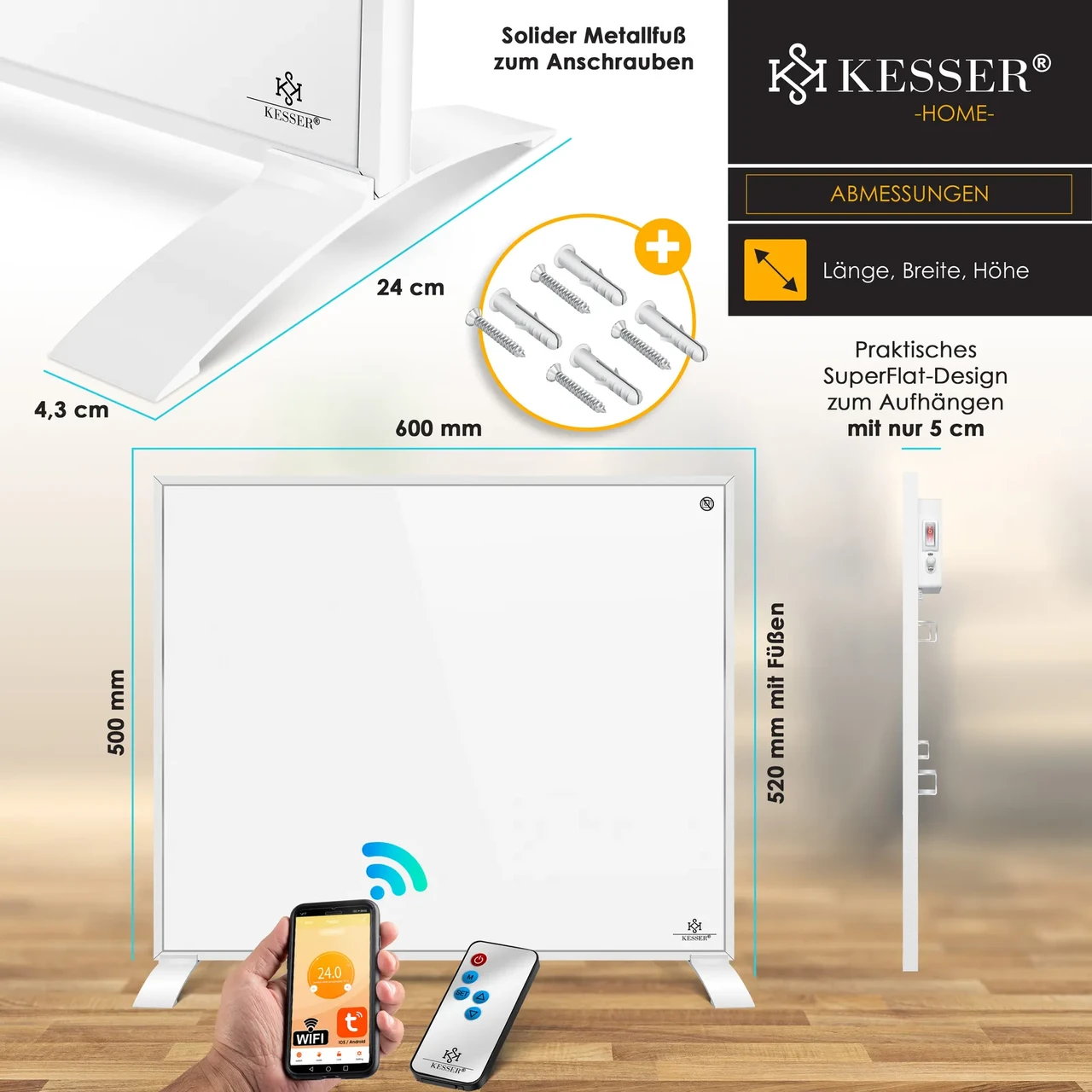 Крім інфрачервоного обігрівача в комплект поставки входить все необхідне для монтажу. Після розпакування нагрівальної плити з дизайном SuperFlat просто виберіть бажану стіну для встановлення. Розмітьте, просвердліть і вставте дюбелі, що входять до комплекту, а потім прикрутіть підвіску за допомогою гвинтів або використовуйте їх, щоб встановити практичні металеві ніжки та встановити обігрівач у кімнаті.