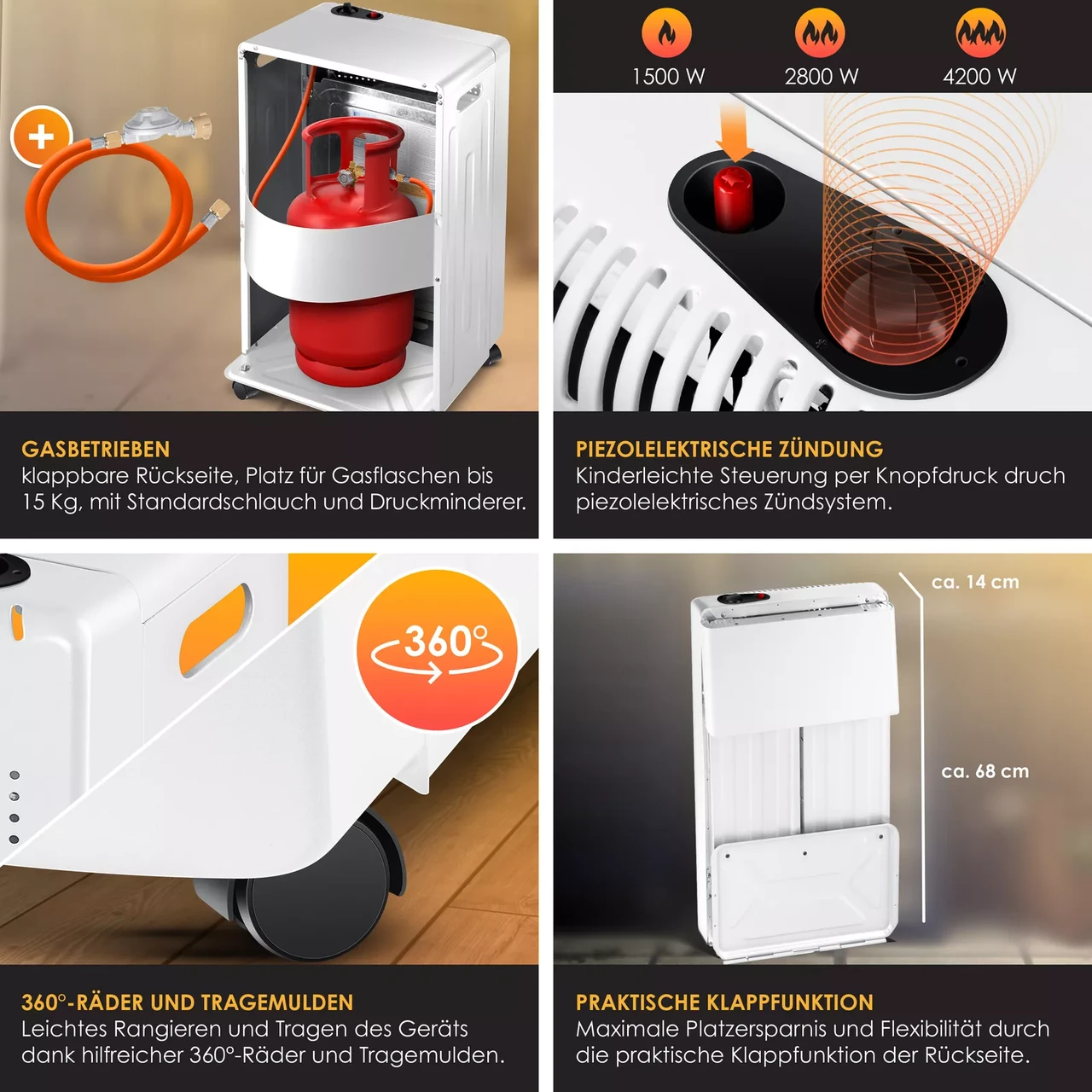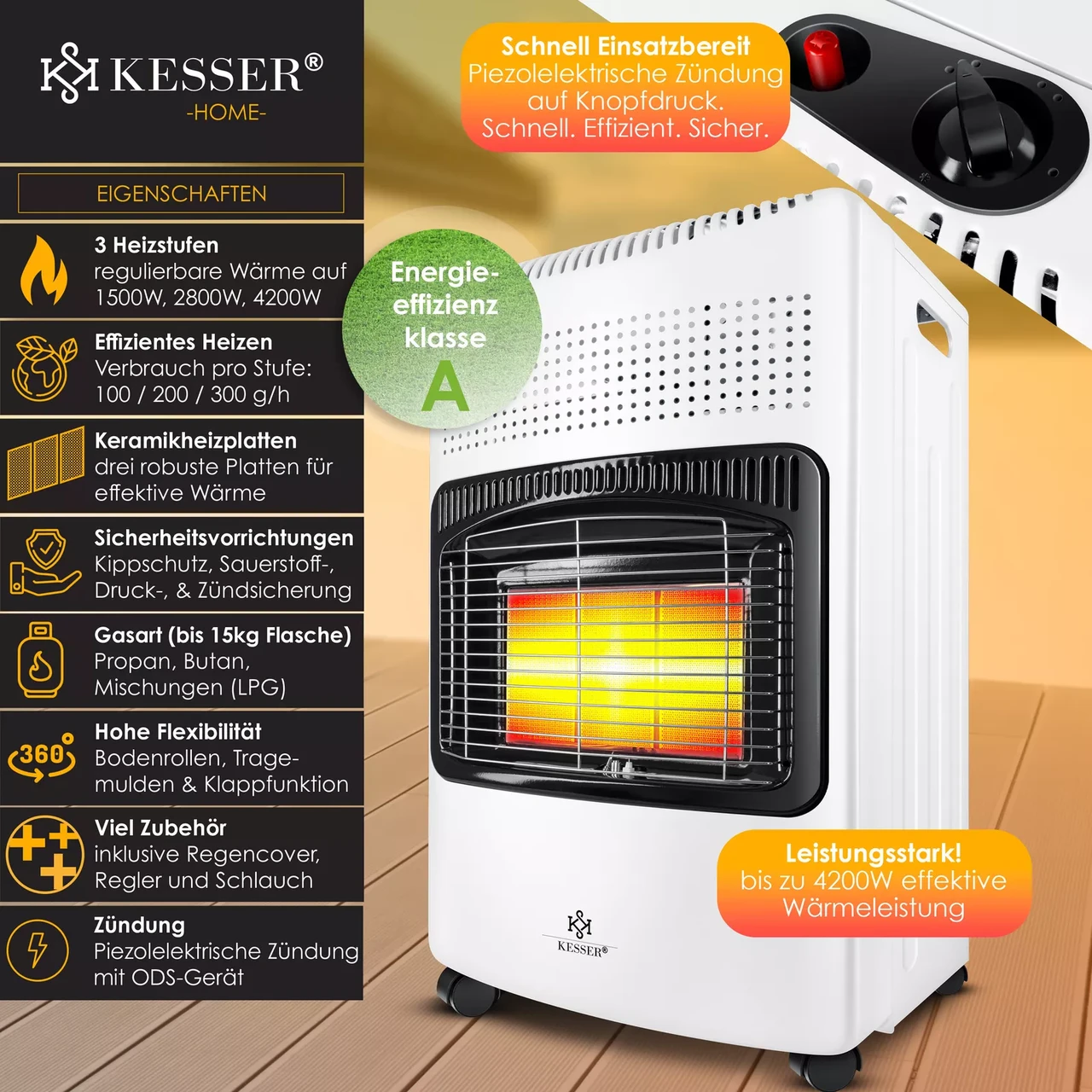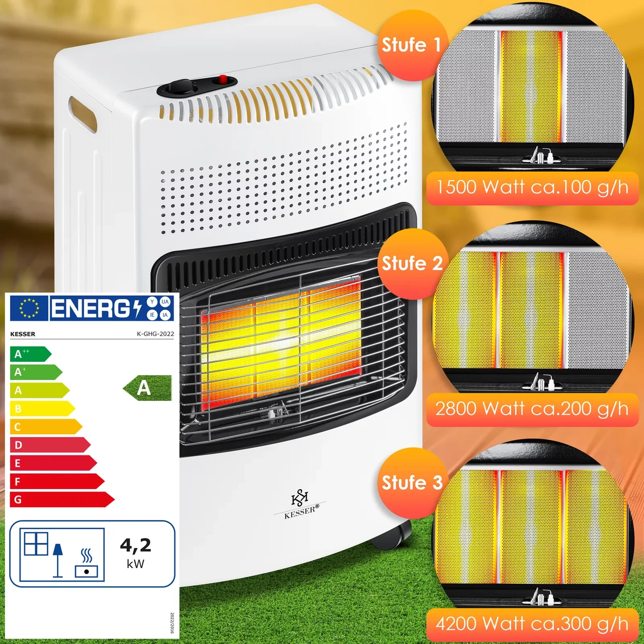Газовий обігрівач KESSER з 3 рівнями нагріву 1500 Вт, 2800 Вт і 4200 Вт, включаючи редуктор тиску та стандартний шланг, розмір пляшки до 15 кг, п’єзоелектричний розпал з пристроєм ODS, низьке споживання, ролики для підлоги 360°