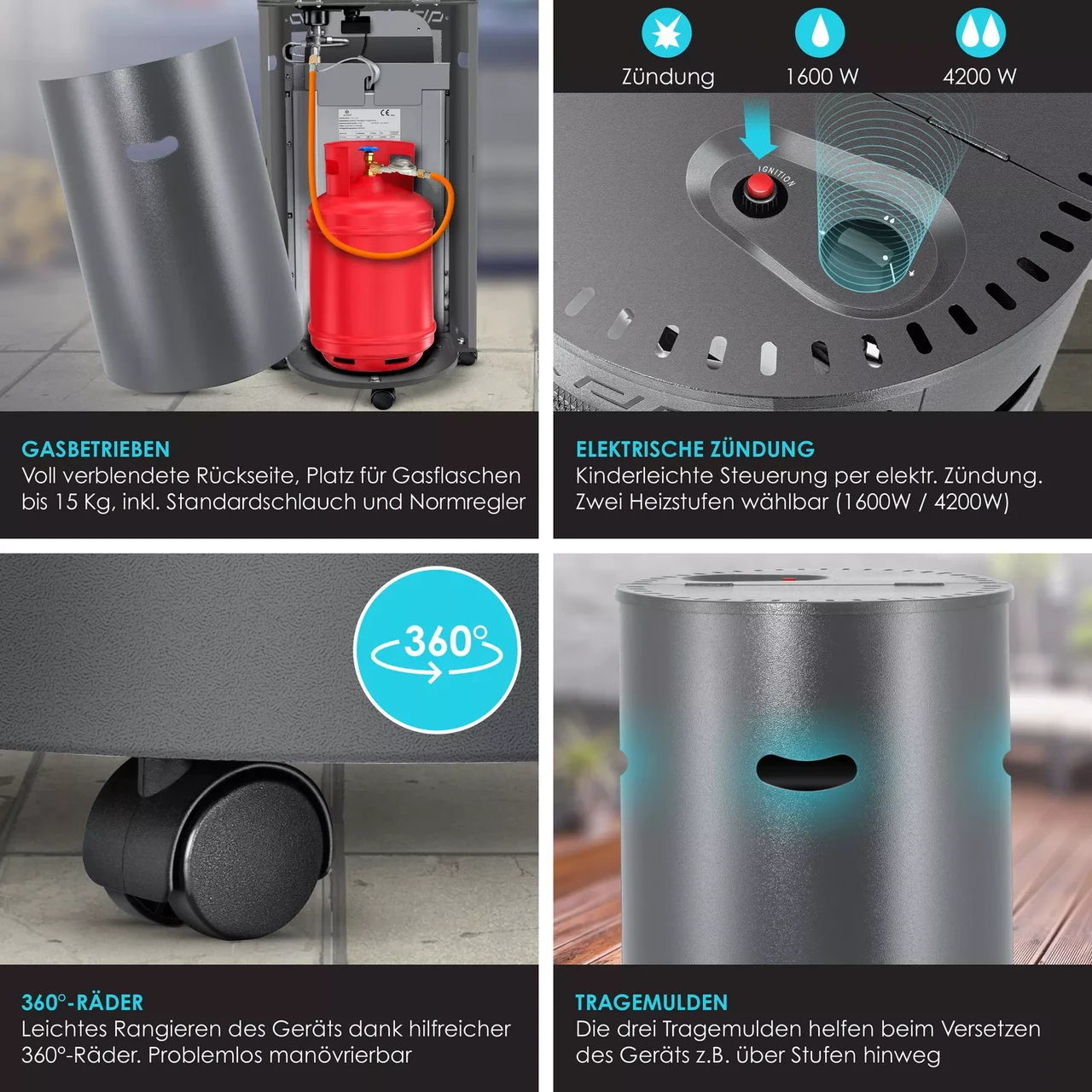 Круглий газовий обігрівач KESSER, елегантний дизайн, два рівні нагріву, природне тепло, повнорозмірна кришка бака, електричне розпалювання, включаючи стандартний шланг і дощовик, а також 3 лотка для транспортування та колеса на 360°