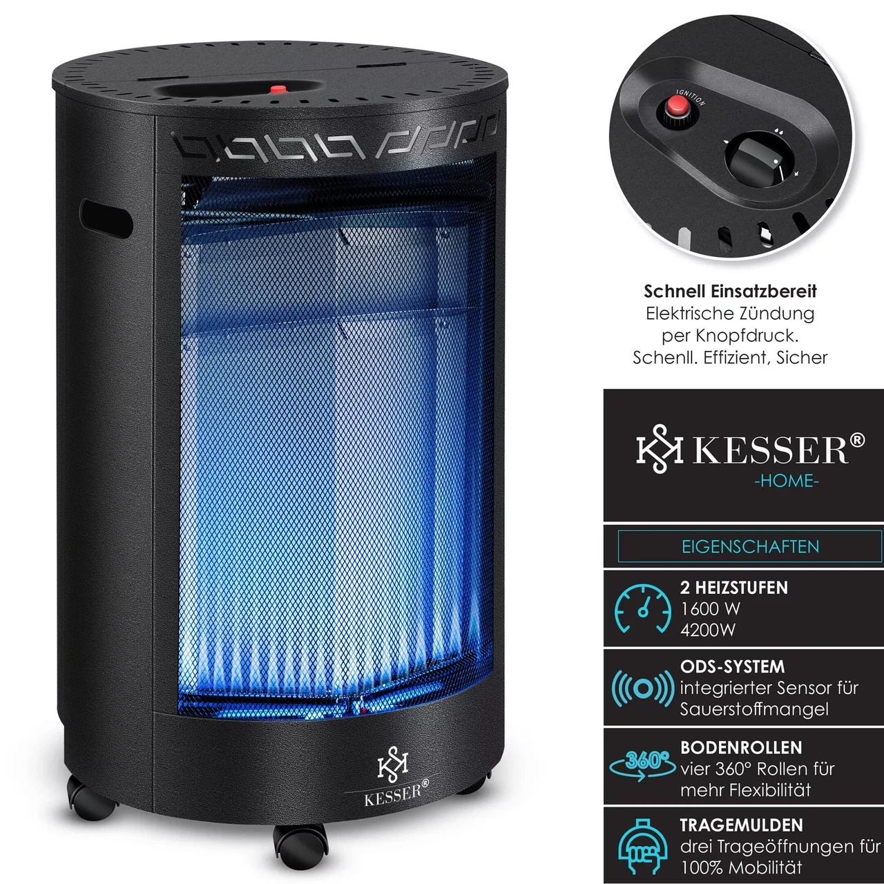 Круглий газовий обігрівач KESSER, елегантний дизайн, два рівні нагріву, природне тепло, повнорозмірна кришка бака, електричне розпалювання, включаючи стандартний шланг і дощовик, а також 3 лотка для транспортування та колеса на 360°
