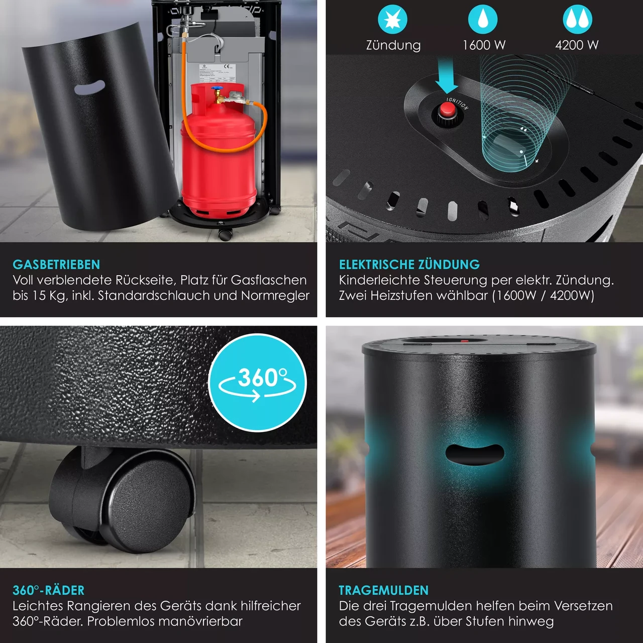 Газовий обігрівач швидко вмикається натисканням кнопки за допомогою електророзпалу, який працює від батарейок типу ААА. Захищене вмикання, щоб діти не могли увімкнути обігрівач. Повністю обшитий панелями радіатор має знімну кришку на задній панелі та практичну заслінку на верхній частині та пропонує місце для газових балонів вагою до 15 кг, які можна під’єднати до стандартного шлангу, що входить у комплект. Два рівні нагріву 1600 Вт і 4200 Вт.