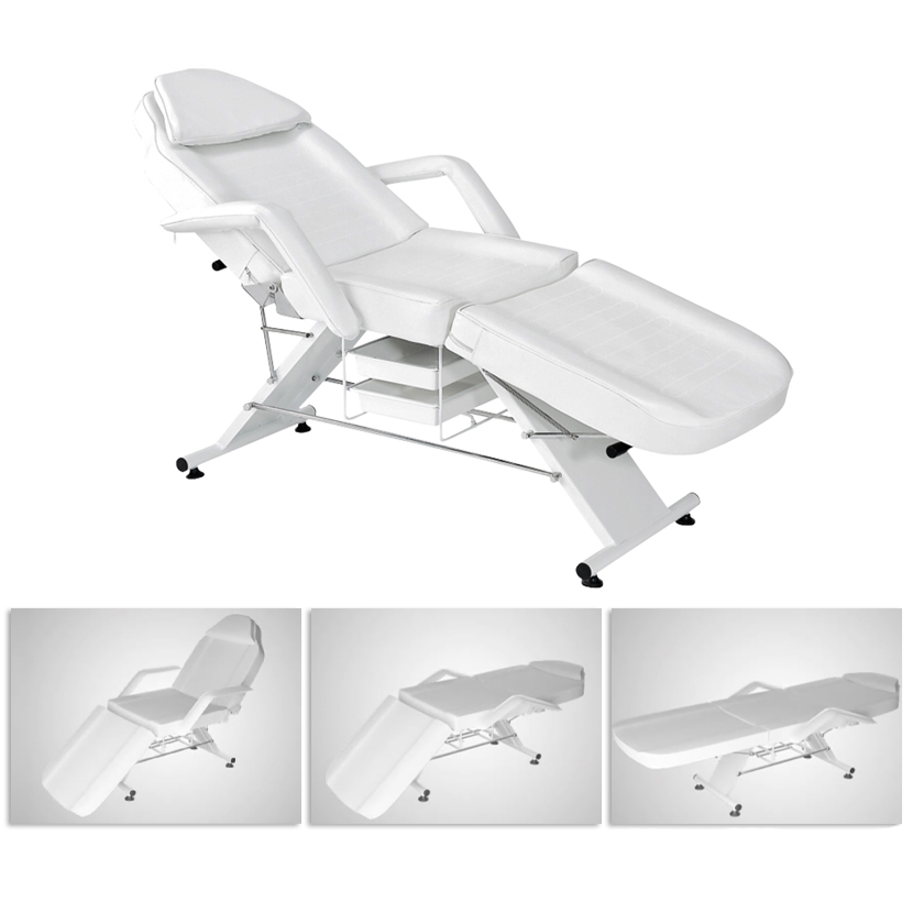 Крісло з отвором у підголівнику, з практичними кюветами, ідеально підходить для косметики, візажу та масажу. Має знімні підлокітники та заглушку у підголовнику. Чохол на сидінні легко миється, виготовлений з еко-шкіри, відповідає суворим вимогам ЄС, естетичний, нікельований металевими елементами.