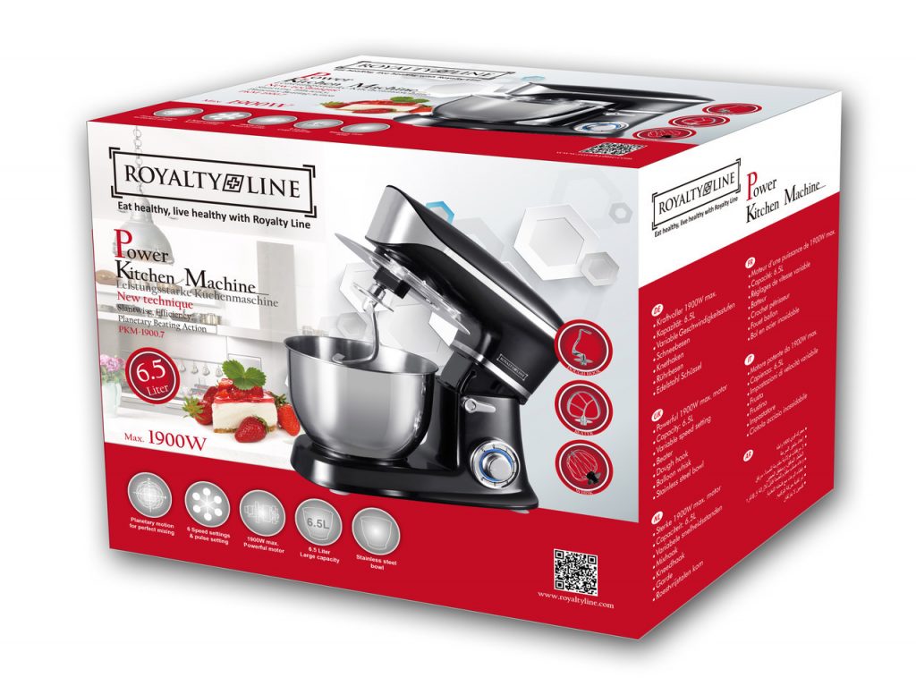 Кухонний комбайн 3в1 Royalty Line RL-PKM-1900.7BG ― виконаний із міцних матеріалів, верх ― щільний пластик, чаша для замісу тіста виконані з нержавіючої сталі, м’ясорубка та всі аксесуари із міцного сплаву металу, чаша блендера виконана з товстого скла.