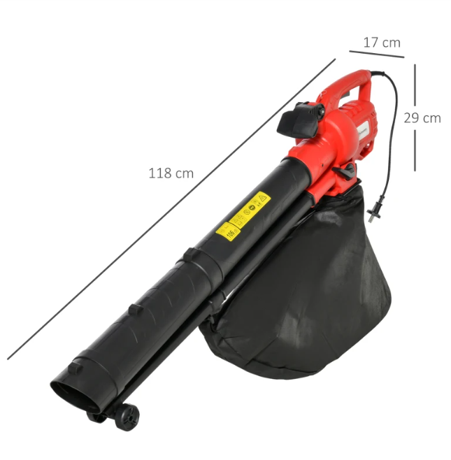 Потужна повітродувка та пилосос Outsunny потужністю 3000 Вт ідеально підходить для збору листя та іншого садового сміття. Співвідношення подрібнення 10:1 у поєднанні з 45-літровим мішком для збирання забезпечує відмінне та легке компостування. Завдяки практичному м’якому плечовому ременю та двом колесам спереду її можна легко транспортувати по саду.