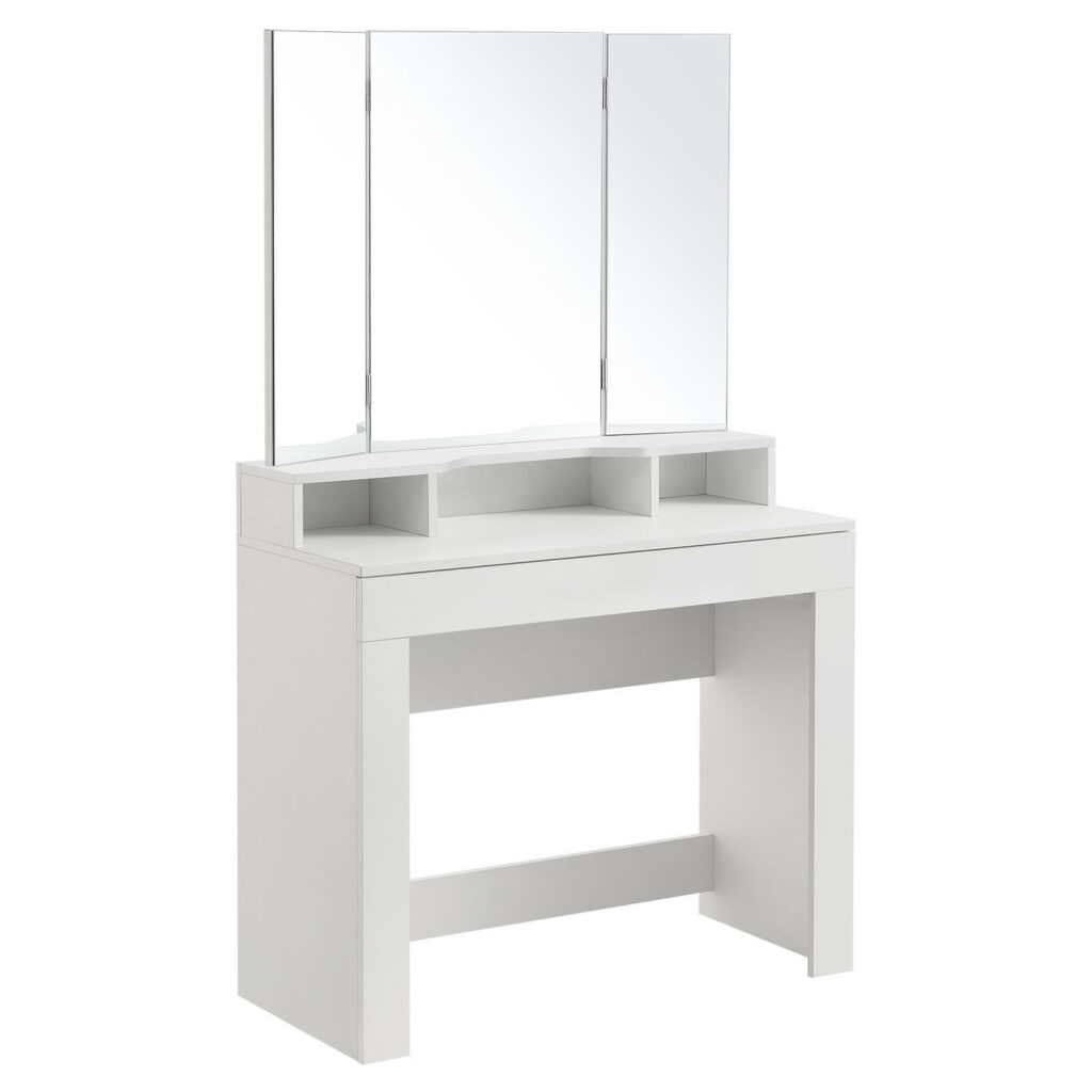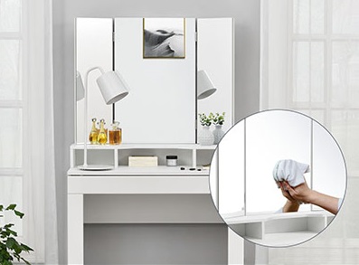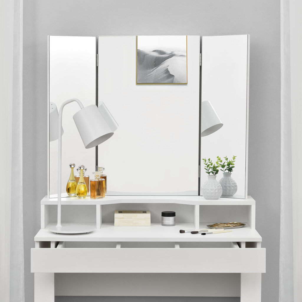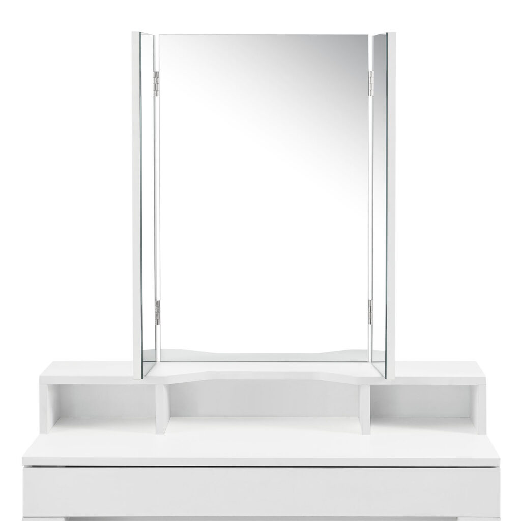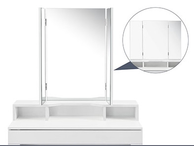 Туалетний столик складається з 1 великого косметичного дзеркала та 2 бічних дзеркал, які можна нахиляти на 180°. 3 прямокутні дзеркала дозволяють бачити себе з будь-якого ракурсу та кута.