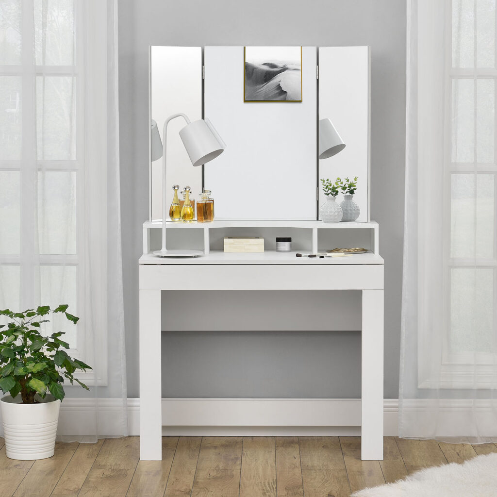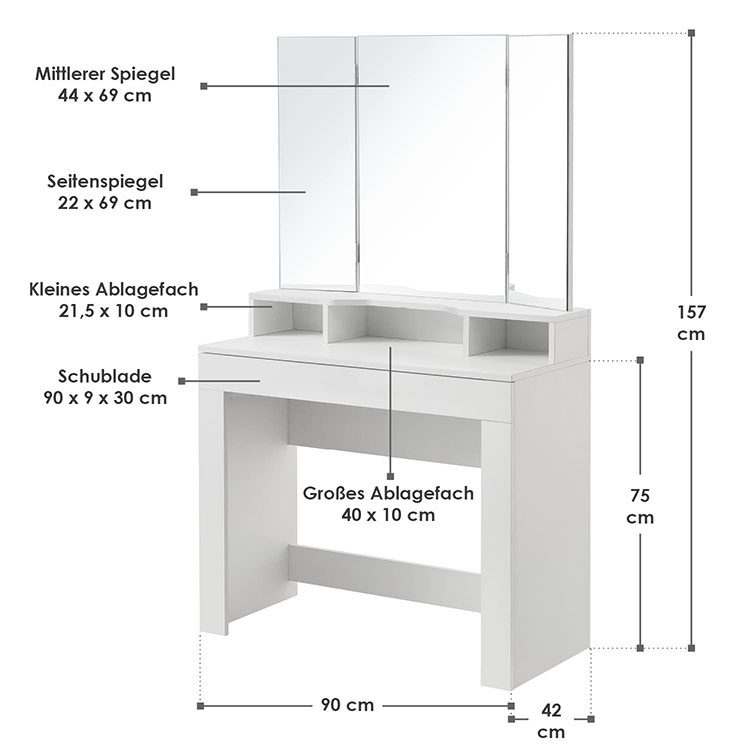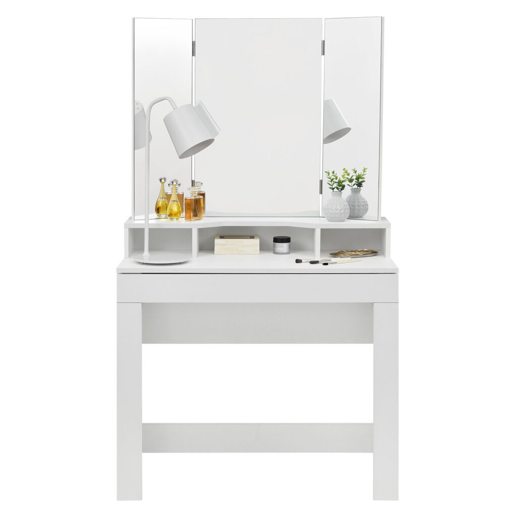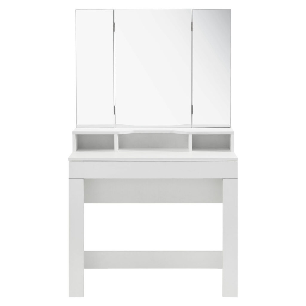 Туалетний столик складається з 1 великого косметичного дзеркала та 2 бічних дзеркал, які можна нахиляти на 180°. 3 прямокутні дзеркала дозволяють бачити себе з будь-якого ракурсу та кута.