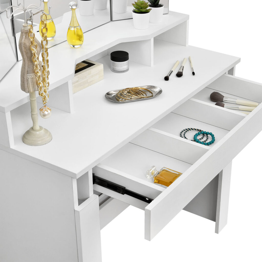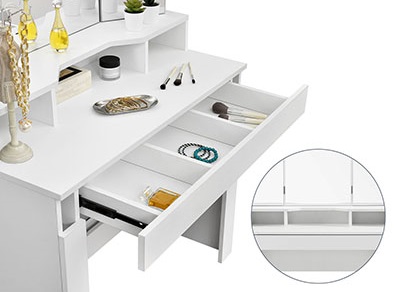 У просторому ящику з трьома відділеннями та додатковими відділеннями на столі модель має достатньо місця для зберігання ваших косметичних засобів.