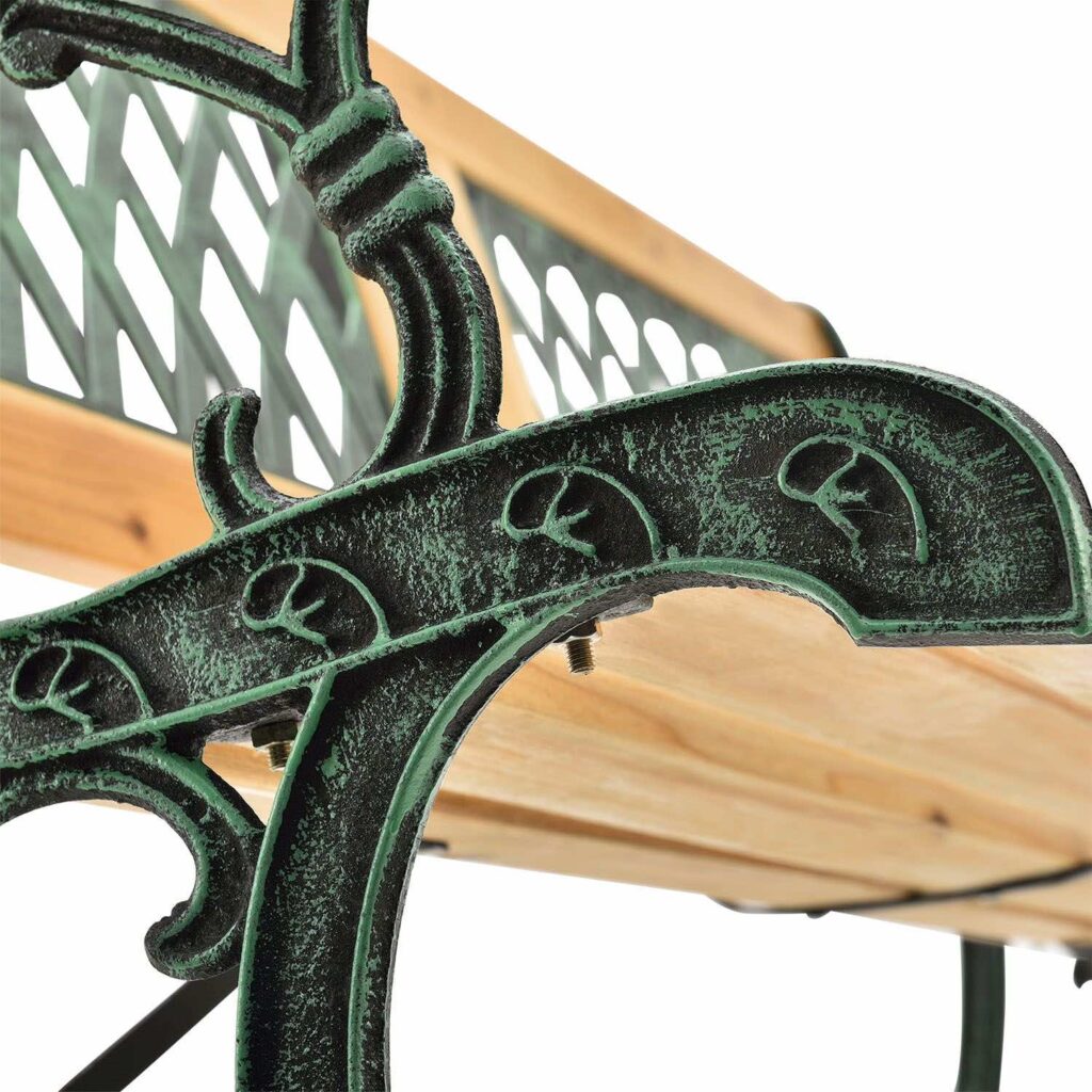 Завдяки дерев’яному каркасу товщиною 18 мм та міцному чавуну лава стійка до вітру та погодних умов зовні. Покриття захищає деревину від зовнішніх впливів, таких як дощ та погода. Ніжки з’єднані з сидінням сполучними розпірками, що забезпечує додаткову стійкість та довговічність.