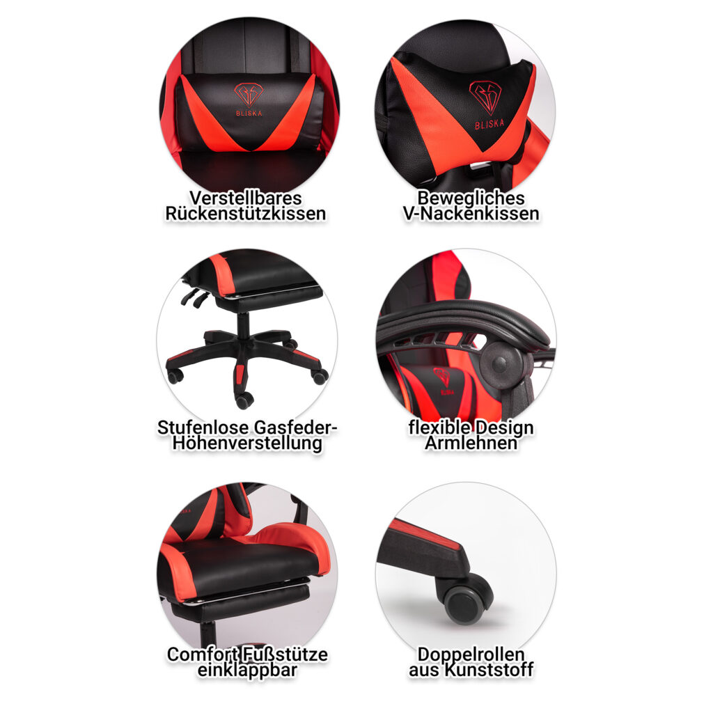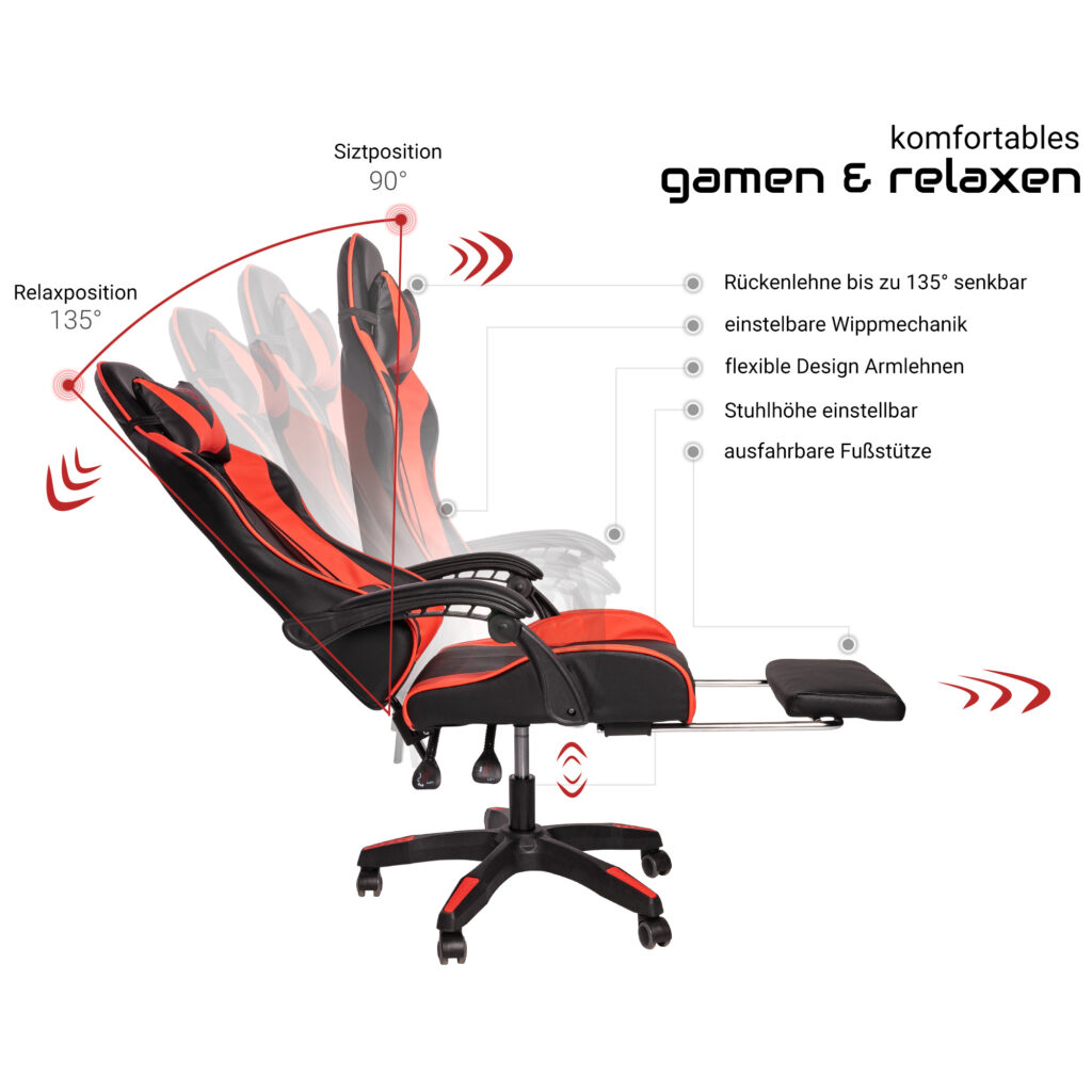 Це крісло, що обертається в спортивному дизайні, зі шкіряною обробкою підходить як як ігрове, так і як зручне крісло для домашнього офісу. Це офісне крісло має гнучкі підлокітники незвичайного дизайну. Спинку крісла можна плавно регулювати. Вбудована висувна підставка для ніг забезпечує найзручніше положення для розслаблення. Зручне крісло, що обертається, можна регулювати по висоті, а так само можна регулювати нахил спинки.