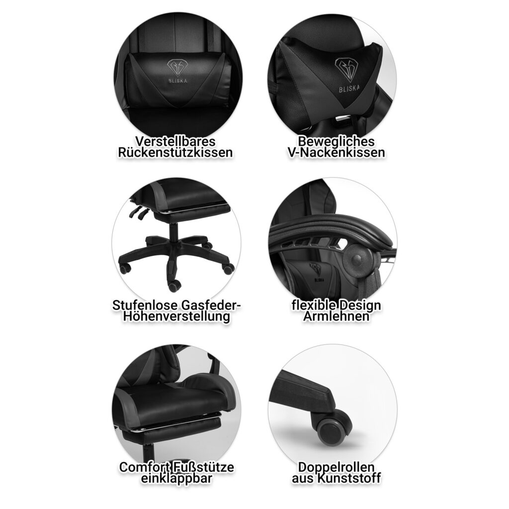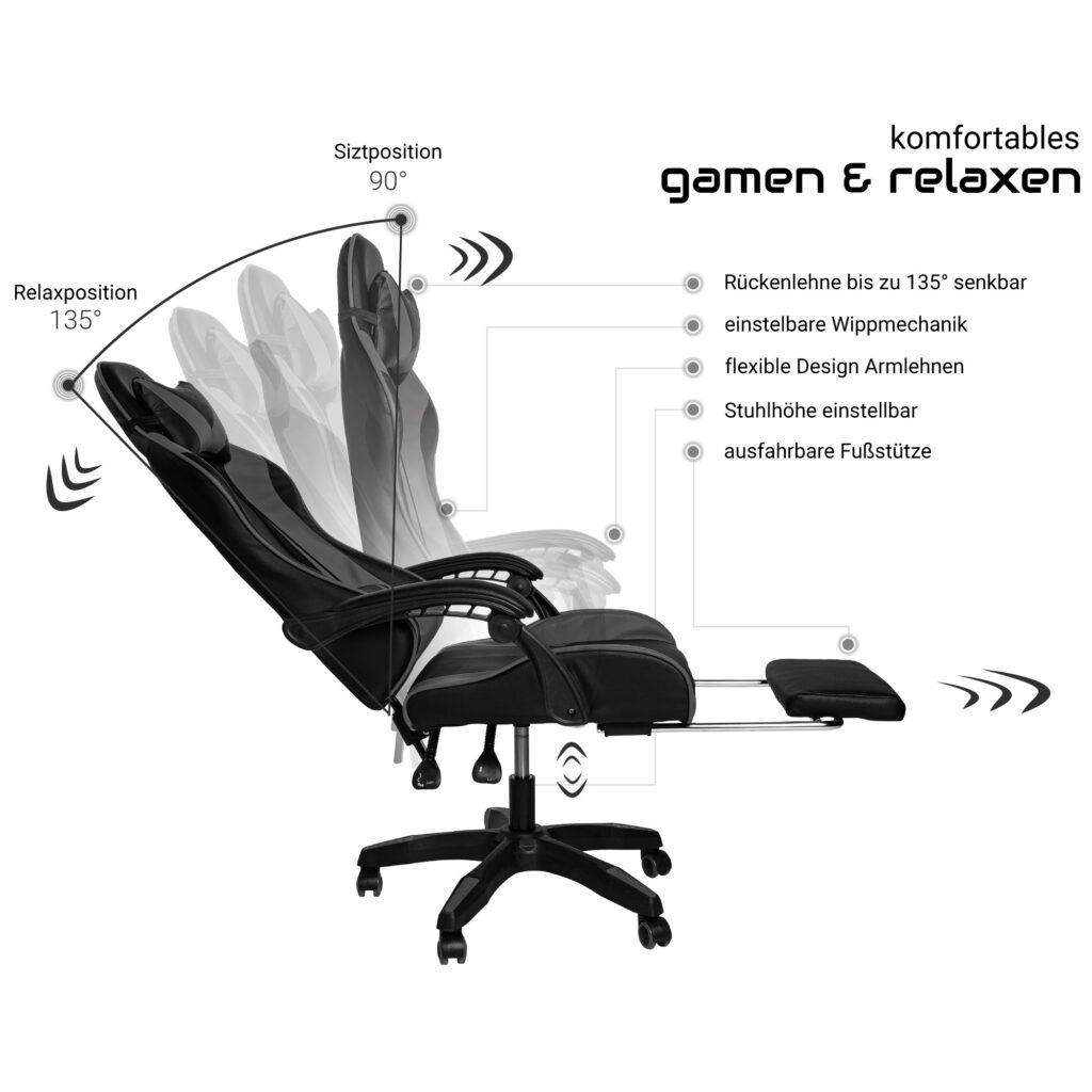 Це крісло, що обертається в спортивному дизайні, зі шкіряною обробкою підходить як як ігрове, так і як зручне крісло для домашнього офісу. Це офісне крісло має гнучкі підлокітники незвичайного дизайну. Спинку крісла можна плавно регулювати. Вбудована висувна підставка для ніг забезпечує найзручніше положення для розслаблення. Зручне крісло, що обертається, можна регулювати по висоті, а так само можна регулювати нахил спинки.