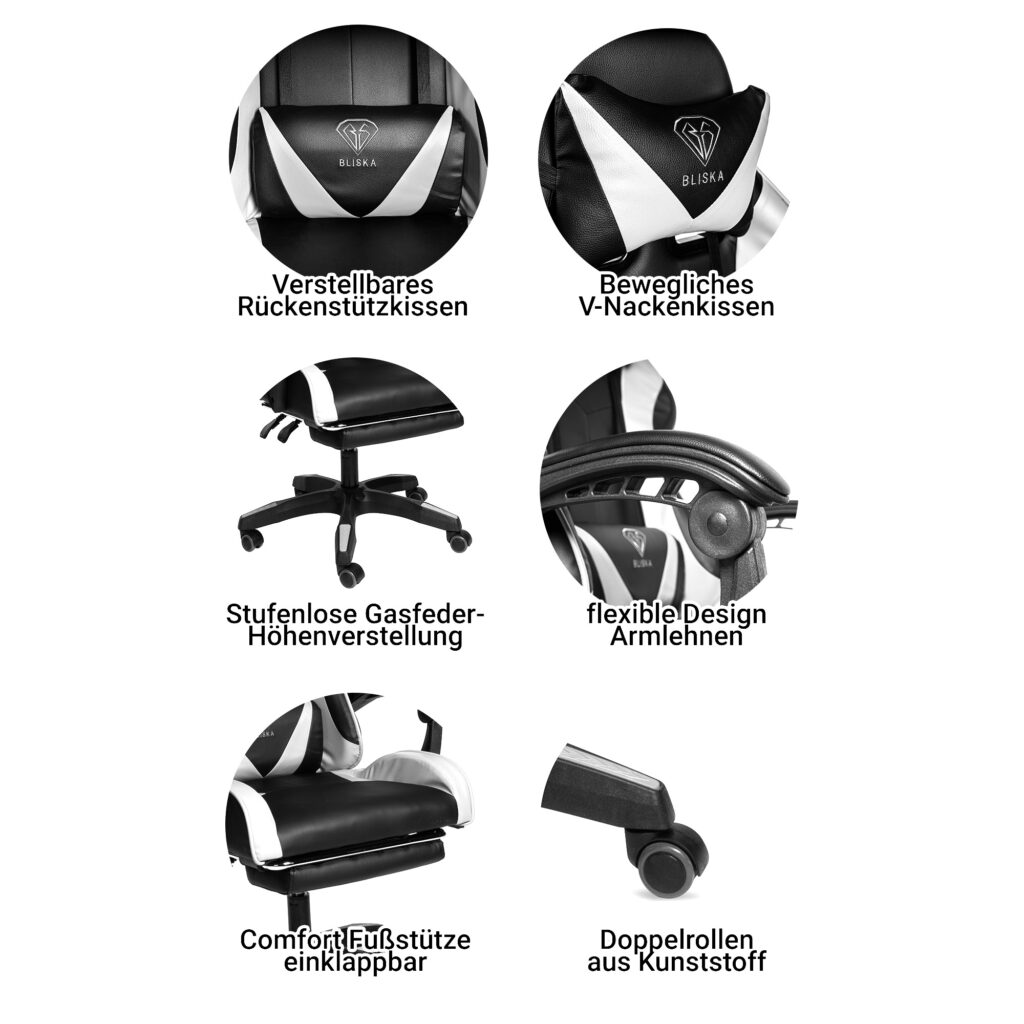 Це крісло, що обертається в спортивному дизайні, зі шкіряною обробкою підходить як як ігрове, так і як зручне крісло для домашнього офісу. Це офісне крісло має гнучкі підлокітники незвичайного дизайну. Спинку крісла можна плавно регулювати. Вбудована висувна підставка для ніг забезпечує найзручніше положення для розслаблення. Зручне крісло, що обертається, можна регулювати по висоті, а так само можна регулювати нахил спинки.