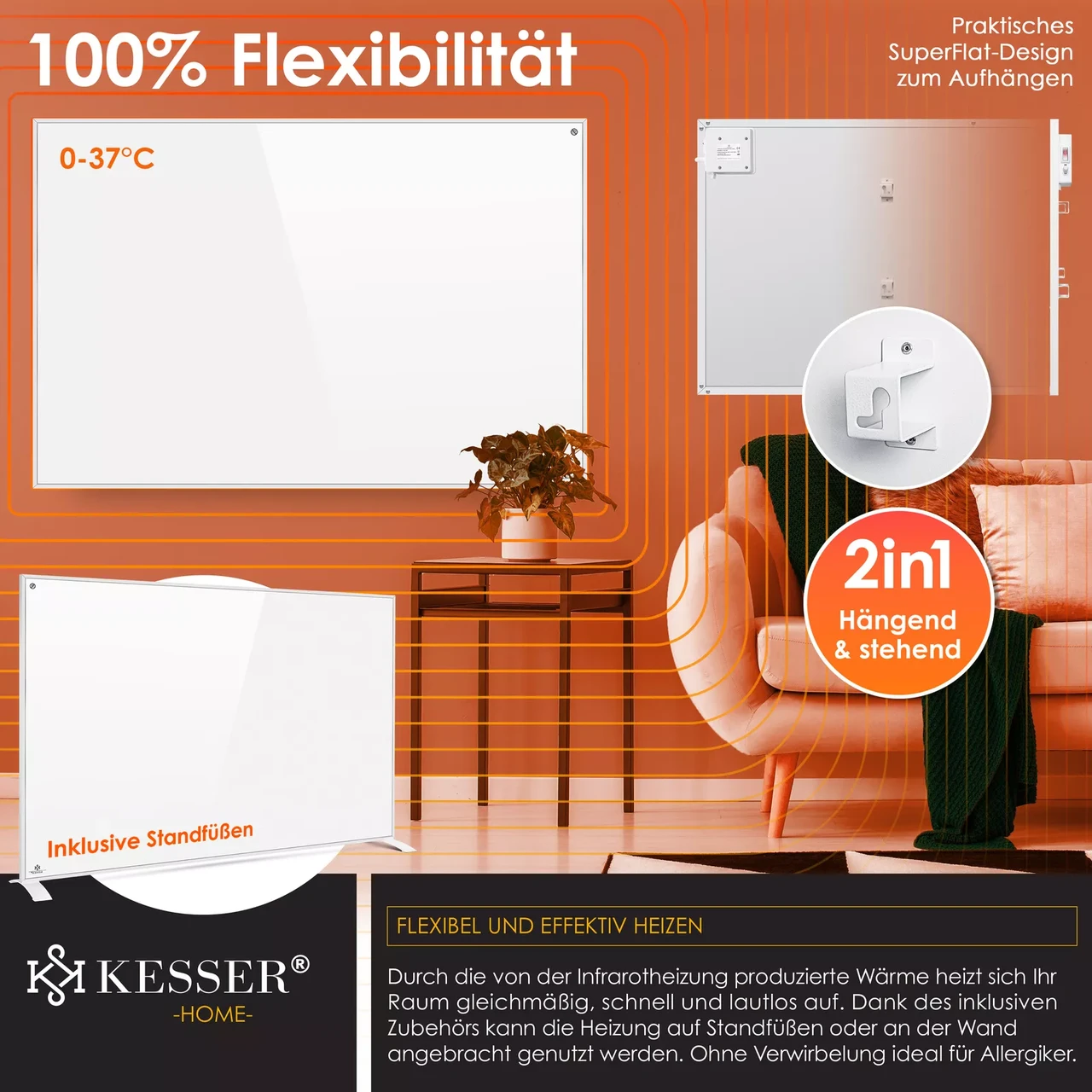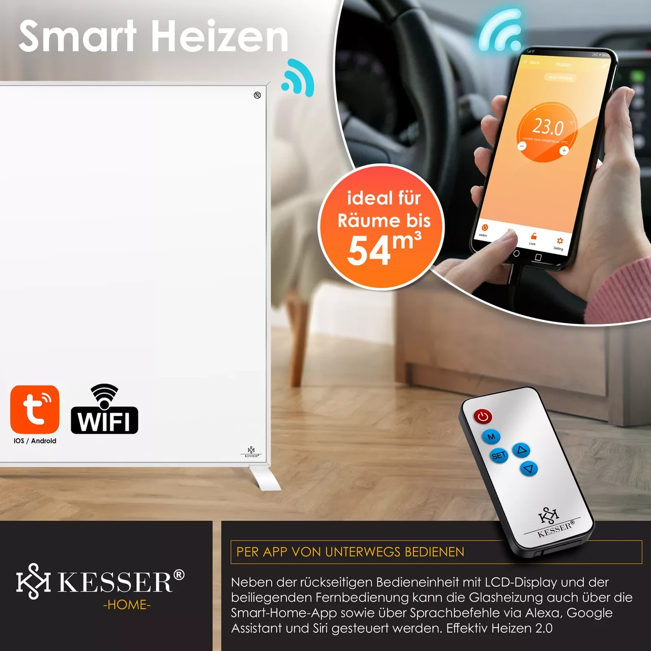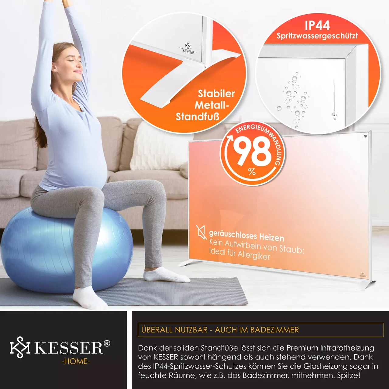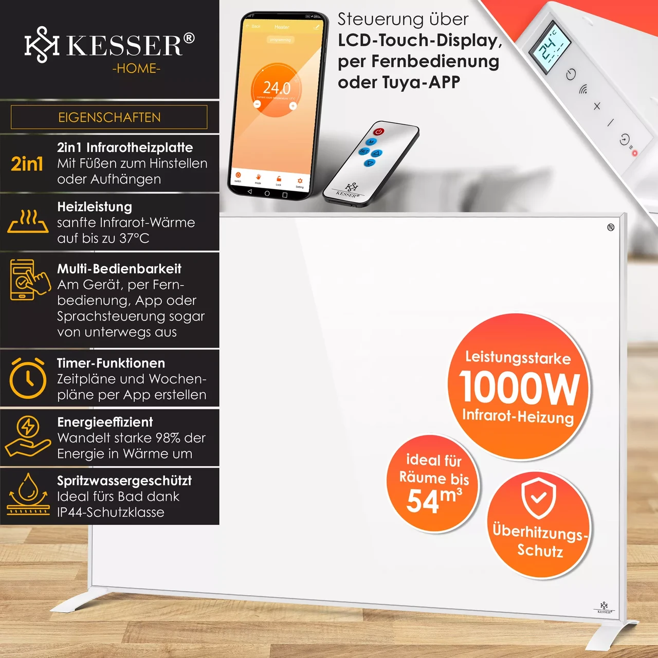 Інфрачервоний обігрівач KESSER 2-в-1 – настінний або стоячий. Клас захисту IP44, ефективний нагрів, захист від бризок, включаючи термостат, функцію таймера, нагрівальну пластину з карбоновим кристалом, РК-дисплей, додаток Tuya Smart і голосове керування. Ідеально підійде як заміна масляного, газового обігрівача або багатьох інших систем опалення. Сертифікація за класом захисту IP44 гарантує оптимальний захист від бризок. Додаткову безпеку забезпечує вбудований захист від перегріву.