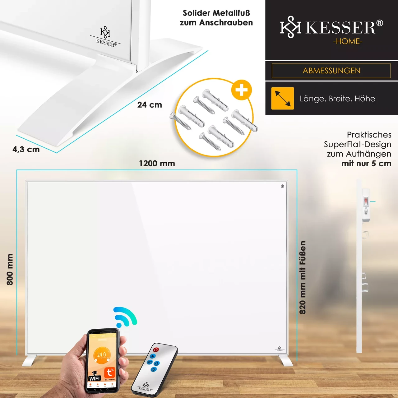 Крім інфрачервоного обігрівача в комплект поставки входить все необхідне для монтажу. Після розпакування нагрівальної плити з дизайном SuperFlat просто виберіть бажану стіну для встановлення. Розмітьте, просвердліть і вставте дюбелі, що входять до комплекту, а потім прикрутіть підвіску за допомогою гвинтів або використовуйте їх, щоб встановити практичні металеві ніжки та встановити обігрівач у кімнаті.