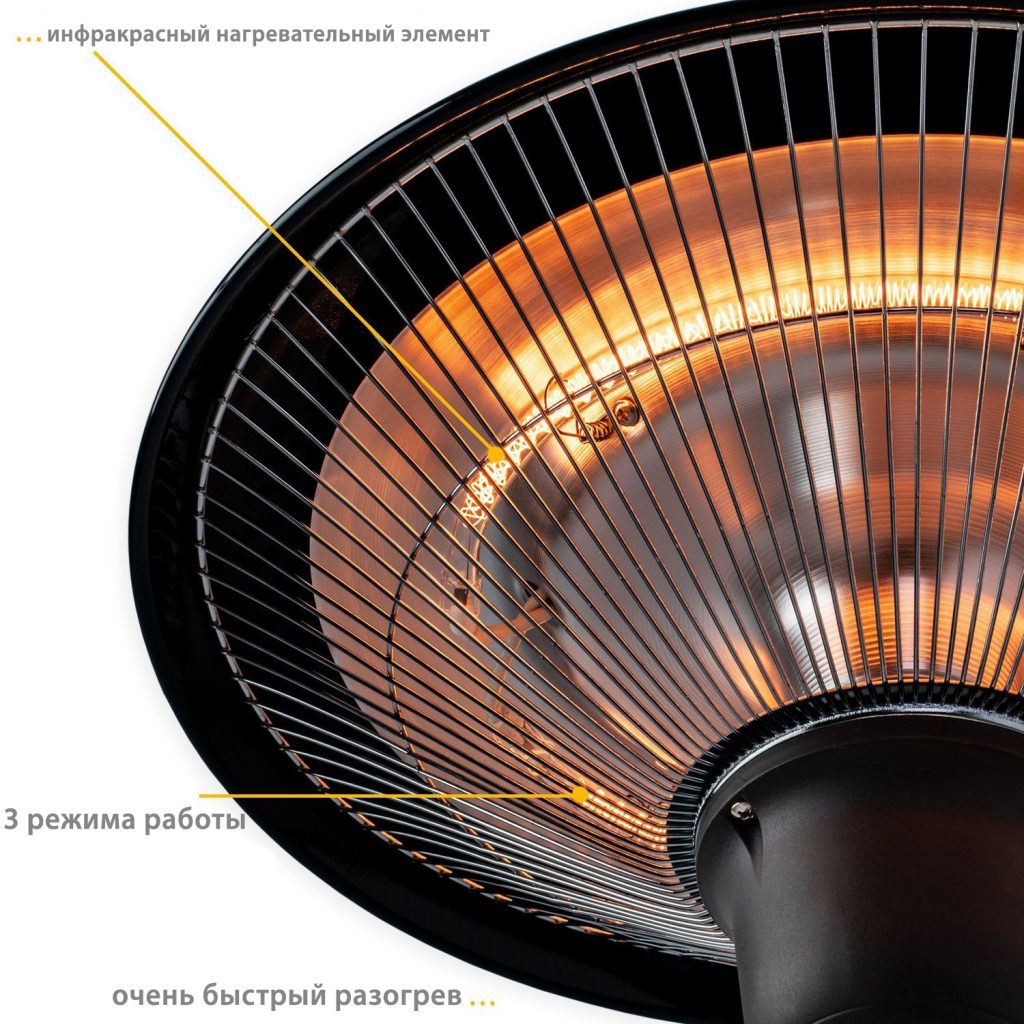 ІНФРАКРАСНИЙ: На відміну від звичайних тепловентиляторів, інфрачервоне випромінювання не тільки нагріває навколишнє повітря, а й передає тепло освітленим людям та об’єктам. М’яке червоне світло забезпечує додатковий затишок.