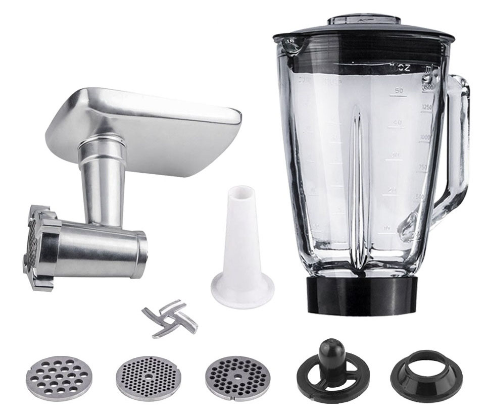 У комплекті ― стандартний набір насадок для м’ясорубки, гак для замісу, насадка для збивання та безпосереднього замісу тіста. Потужність комбайна – 1900 Вт. 6 режимів роботи, плюс режим пульсації та плавне регулювання. Кухонний комбайн працюємо порівняно тихо. У комплекті є прозорий захист від бризок, об’єм чаші блендера 1,5 л, є міркова шкала, об’єм чаші для замісу – 6,5 л. М’ясорубку та блендер легко встановлювати. Комбайн швидко розуміється. В основі є присоски, які не допускають ковзання комбайна по будь-якій поверхні.