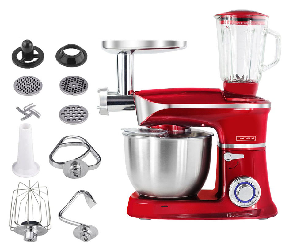 Кухонний комбайн 3в1 Royalty Line RL-PKM-1900.7BG ― виконаний із міцних матеріалів, верх ― щільний пластик, чаша для замісу тіста виконані з нержавіючої сталі, м’ясорубка та всі аксесуари із міцного сплаву металу, чаша блендера виконана з товстого скла.