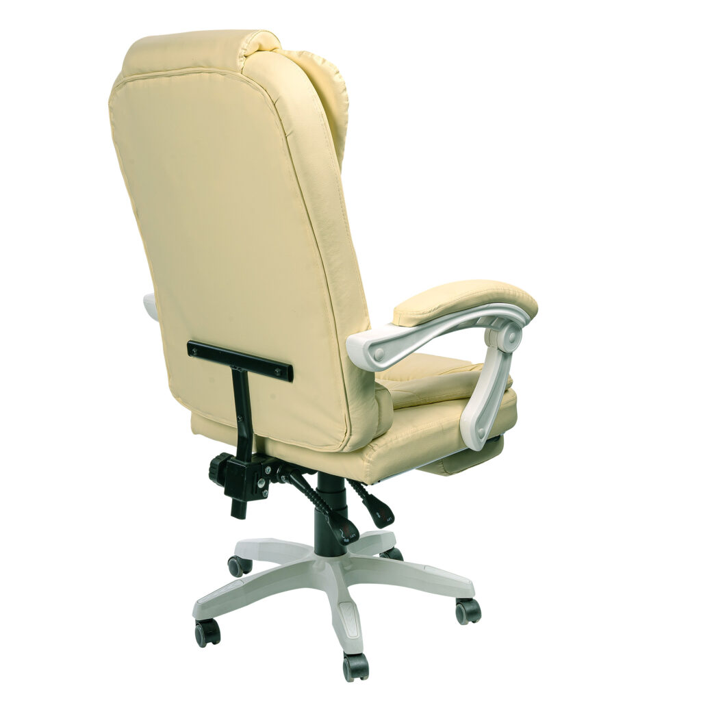 Габарити 69 × 63,5 × 36 мм Гнучке крісло з елегантним дизайном, імітуючим шкіру. Це офісне крісло оснащене гнуткими м’якими триточечними підлокітниками. Його можна встановити в розслаблюючому положенні, а підлокотники адаптуються до цього розміщення. Для максимального розслаблення м’якої підставки для ног можна просто виграти. Крисло, що обертається, можна регулювати по висоті, а так само можна регулювати нахил спинки.