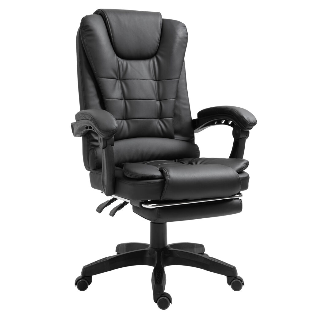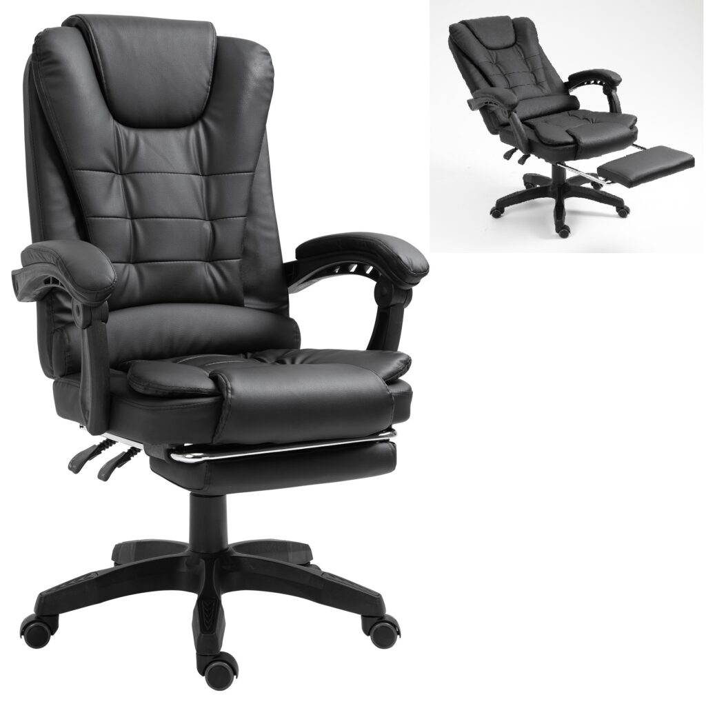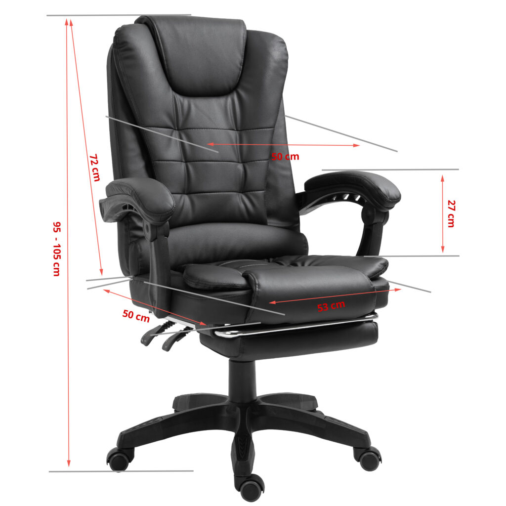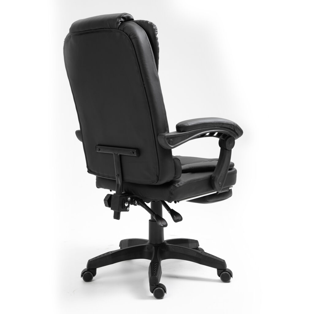 Габарити 69 × 63,5 × 36 мм Гнучке крісло з елегантним дизайном, що імітує шкіру. Це офісне крісло оснащене м’якими гнучкими триточковими підлокітниками. Його можна встановити розслаблююче положення, а підлокітники адаптуються до цього положення. Для максимального розслаблення м’яку підставку для ніг можна вийняти. Крісло, що обертається, можна регулювати по висоті, а так само можна регулювати нахил спинки.