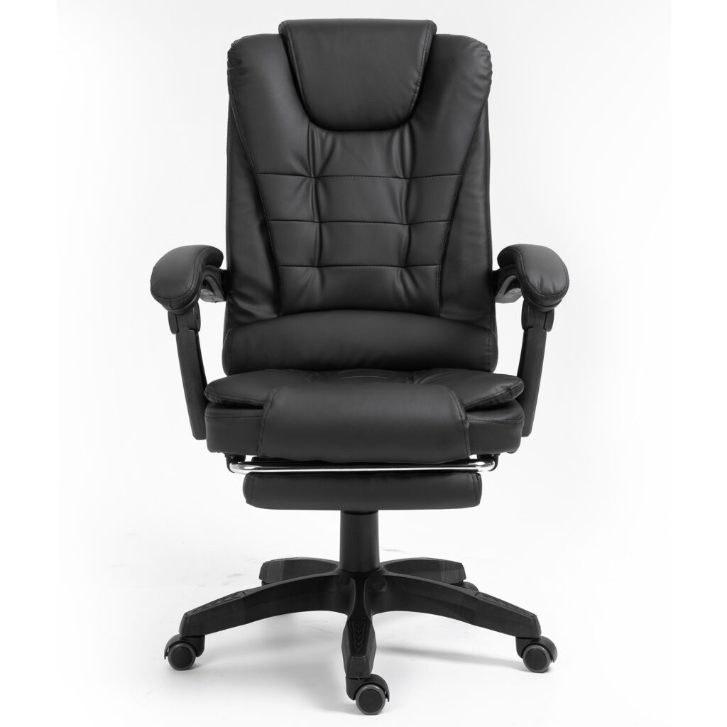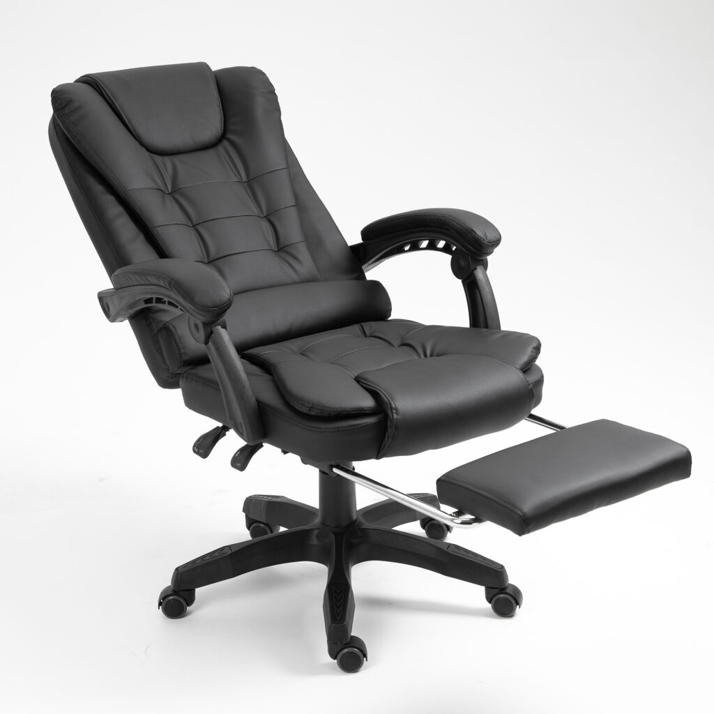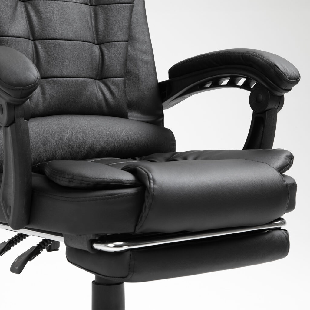 Гнучке крісло з елегантним дизайном, що імітує шкіру. Це офісне крісло оснащене м’якими гнучкими триточковими підлокітниками. Його можна встановити розслаблююче положення, а підлокітники адаптуються до цього положення. Для максимального розслаблення м’яку підставку для ніг можна вийняти. Крісло, що обертається, можна регулювати по висоті, а так само можна регулювати нахил спинки.