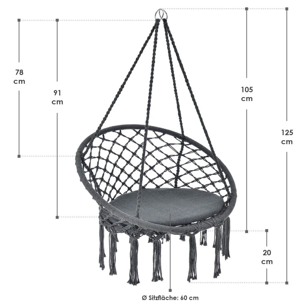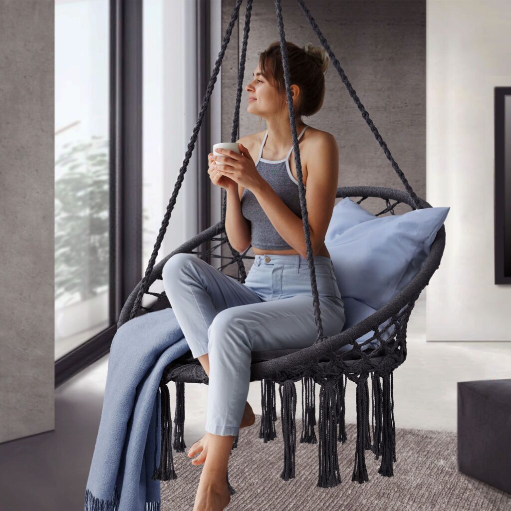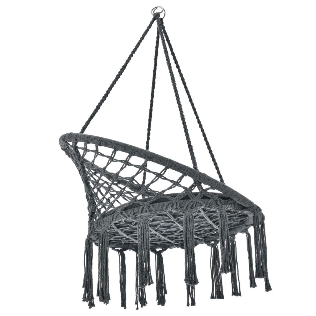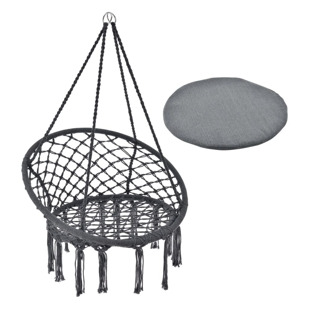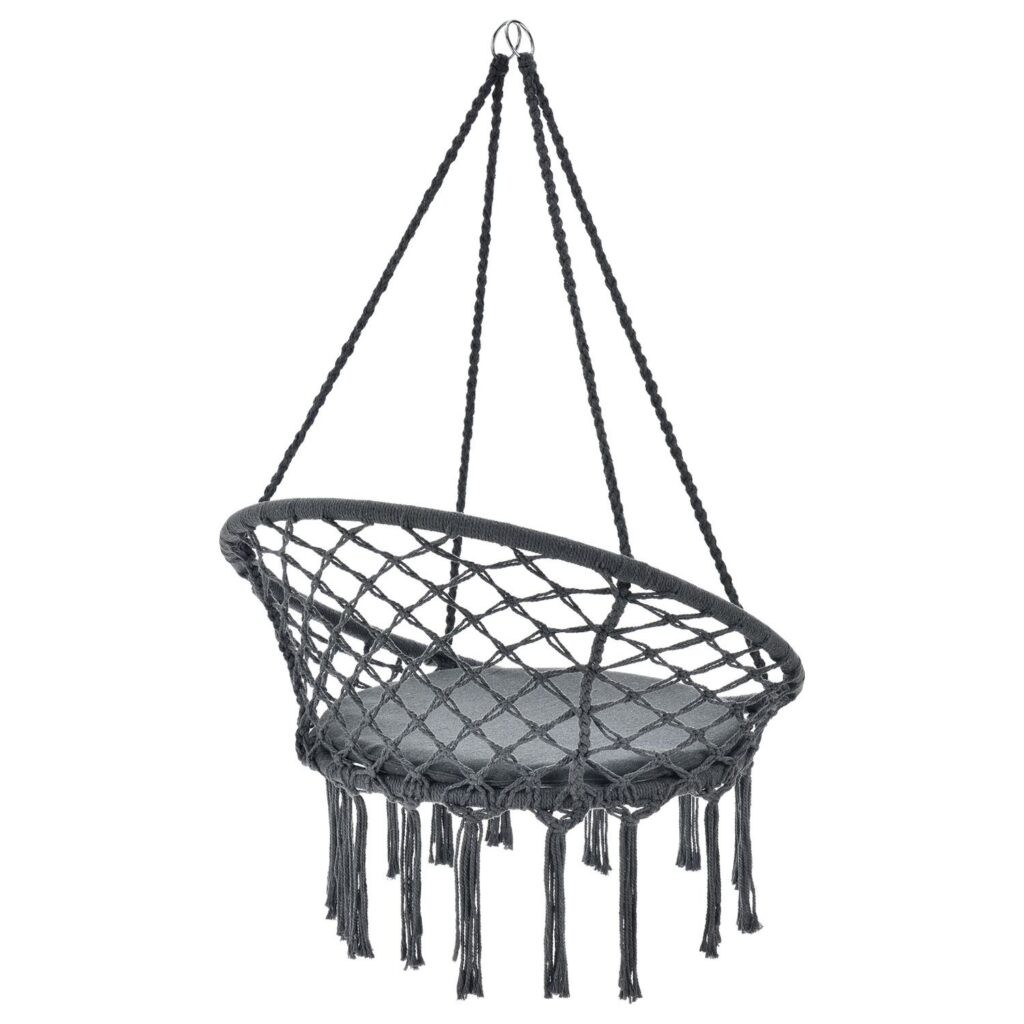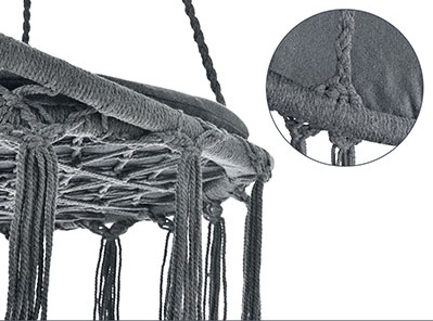Завдяки унікальному дизайну макрамі ви точно в тренді. Техніка в’язання вузлів у стилі бохо, що зародилася на Сході, створює затишну атмосферу та нині використовується у численних декоративних елементах. Простий темно-сірий колір підвісного сидіння чудово впишеться у вашу вітальню.