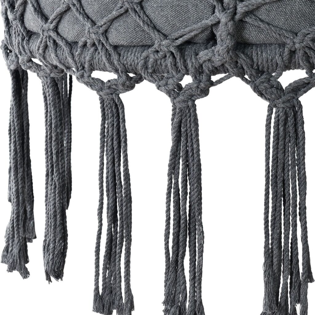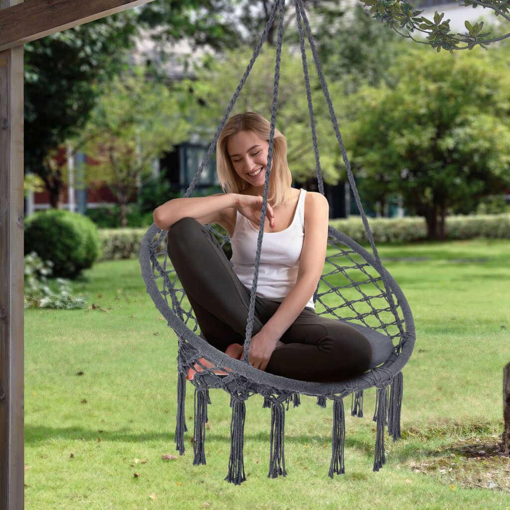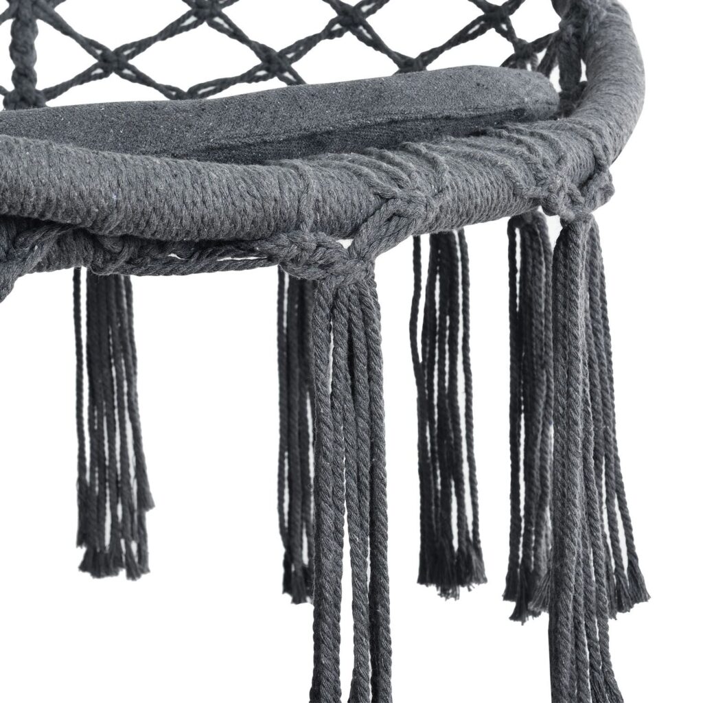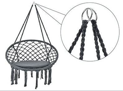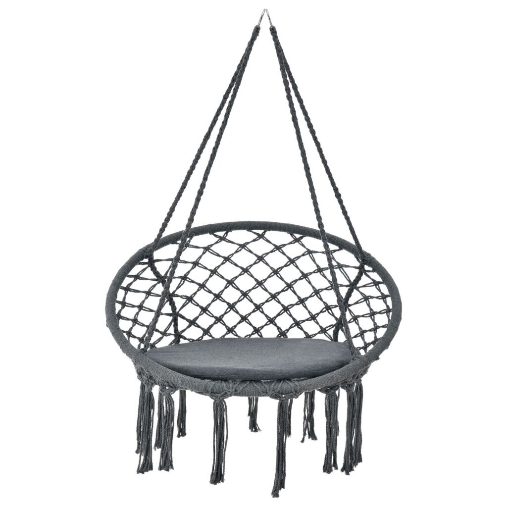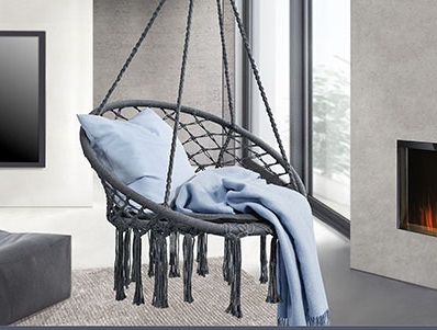 Завдяки унікальному дизайну макрамі ви точно в тренді. Техніка в’язання вузлів у стилі бохо, що зародилася на Сході, створює затишну атмосферу та нині використовується у численних декоративних елементах. Простий темно-сірий колір підвісного сидіння чудово впишеться у вашу вітальню.
