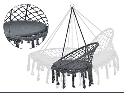 В комплект входить подушка товщиною 3 см і шириною 60 см, на якій можна розслабитися та завершити день. Широке сидіння з оббивкою пропонує достатньо місця, щоб розтягнутися та розслабитися. М’яке похитування підвісного кошика заспокоює і дозволяє забути про денні турботи.