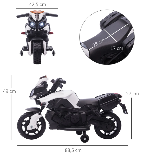 Дитячий мотоцикл HOMCOM має робочий звуковий сигнал і фари для інтерактивного досвіду. За допомогою педалей ви можете їздити вперед і назад і їздити як Big F. Велике сидіння та кермо дозволяють зручно сидіти та триматися. Колеса забезпечують постійний баланс і, таким чином, безпеку. Мотоцикл поставляється з акумуляторною батареєю - повної зарядки вистачає до 45 хвилин гри. опис: ✔ Завдяки працюючим фарам цей велосипедний мотоцикл подарує вашим дітям справжнє враження від їзди ✔ Мотоцикл з педальним приводом, швидкість може досягати максимум 3 км/год ✔ В комплект входить якісний акумулятор і зарядний пристрій ✔ Цей мотоцикл може безперервно працювати протягом 45 хвилин після повної зарядки ✔ Дві широкі текстуровані шини з опорними колесами забезпечують стабільне та плавне водіння ✔ Рекомендовано для дітей від 18 до 36 місяців ✔ Природно розвиває координацію рук і очей під час гри та сміху ✔ Легко збирається ✔ Зверніть увагу, що цей предмет можна використовувати лише під наглядом дорослих.Технічні характеристики: ✔ Колір: білий + чорний ✔ Габаритні розміри: 88,5 Д x 42,5 Ш x 49 В см ✔ Розмір сидіння: 28 Д x 17 Ш см x 27 В (від підлоги) см ✔ Розмір колеса: Ø21см ✔ Час зарядки: 10-12 годин ✔ Безперервний час відтворення (повністю заряджений): 45 хв ✔ Матеріал: ПП пластик, сталь ✔ Двигун: 6В ✔ Зарядний пристрій: 6V, 4.5AH ✔ Підходить для дітей від 18 до 48 місяців ✔ Вантажопідйомність: 25 кг Обсяг поставки: ✔ 1 електричний мотоцикл ✔ 1 посібник користувача -